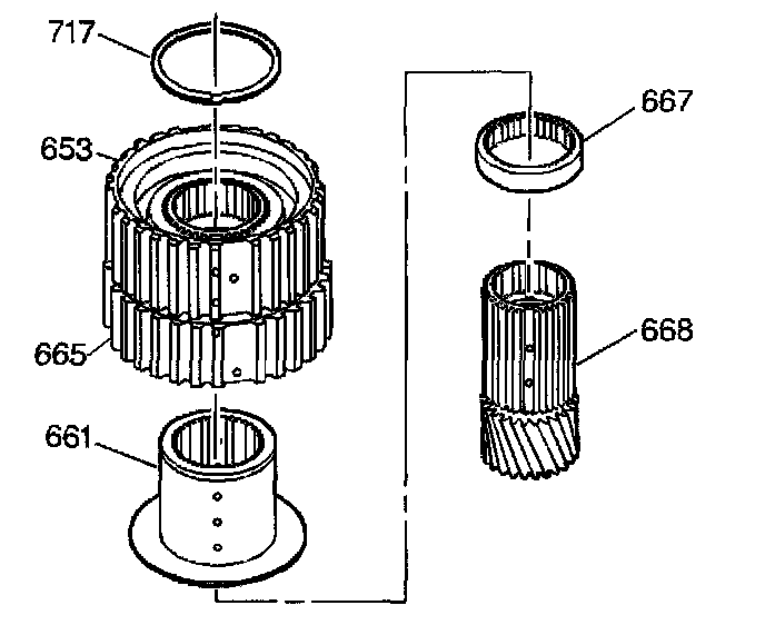 4. Remove the input and third clutch sprag inner race (661) and the input sun gear spacer (667) from the input sun gear (668).