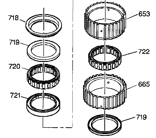 6. Remove the input and third clutch sprag end bearings (719) and the input and third clutch sprag center bearing (721) from the sprag outer races (653, 665).