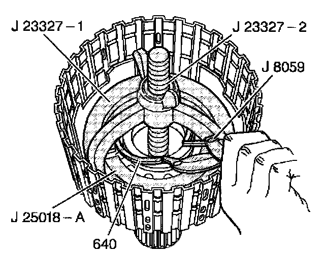10. Use J 23327 and J 25018-A in order to compress the third clutch spring retainer and guide assembly.
