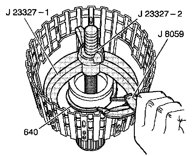15. Use J 23327 in order to compress the input clutch spring and retainer assembly.