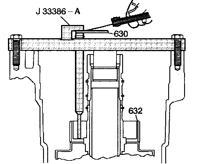 12. Use a feeler gauge in order to measure the clearance between J 33386-A and the thrust washer (630).