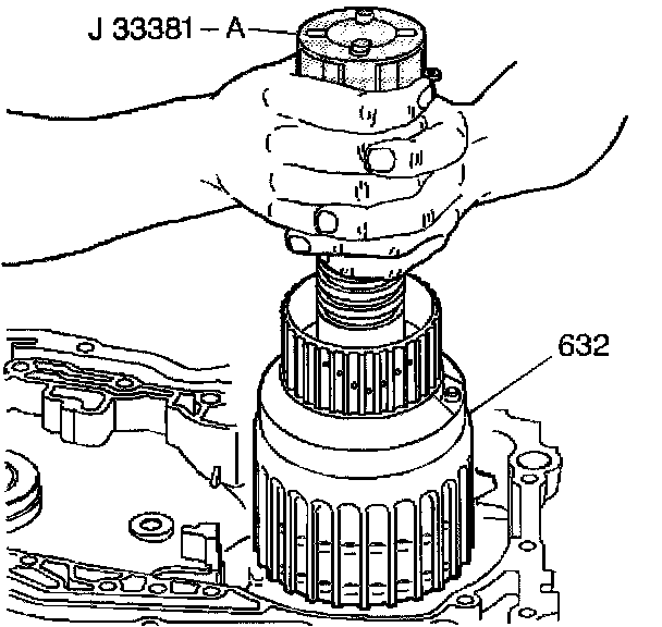 15. Install J 33381-A into the input clutch housing (632).