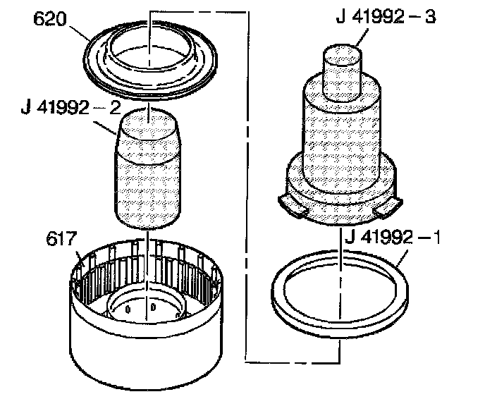 2. Install the second clutch piston (620) and J 41992-3 into J 41992-1 protector.