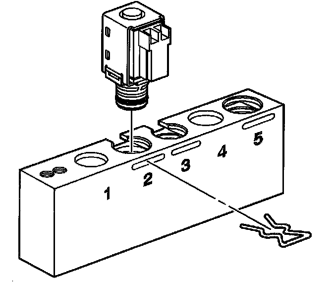 2. Install the 1-2, 3-4 or the 2-3 shift solenoid valve into bore number 2 of the J 44246 and install the factory retainer clip to retain the solenoid.