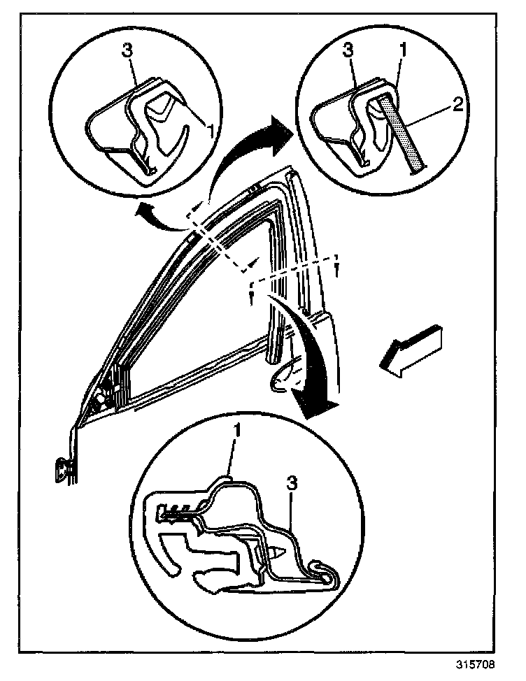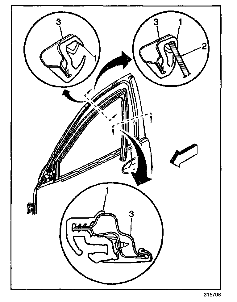 1. Position the window weatherstrip to the door (3) starting in the corner. Work out in both directions.