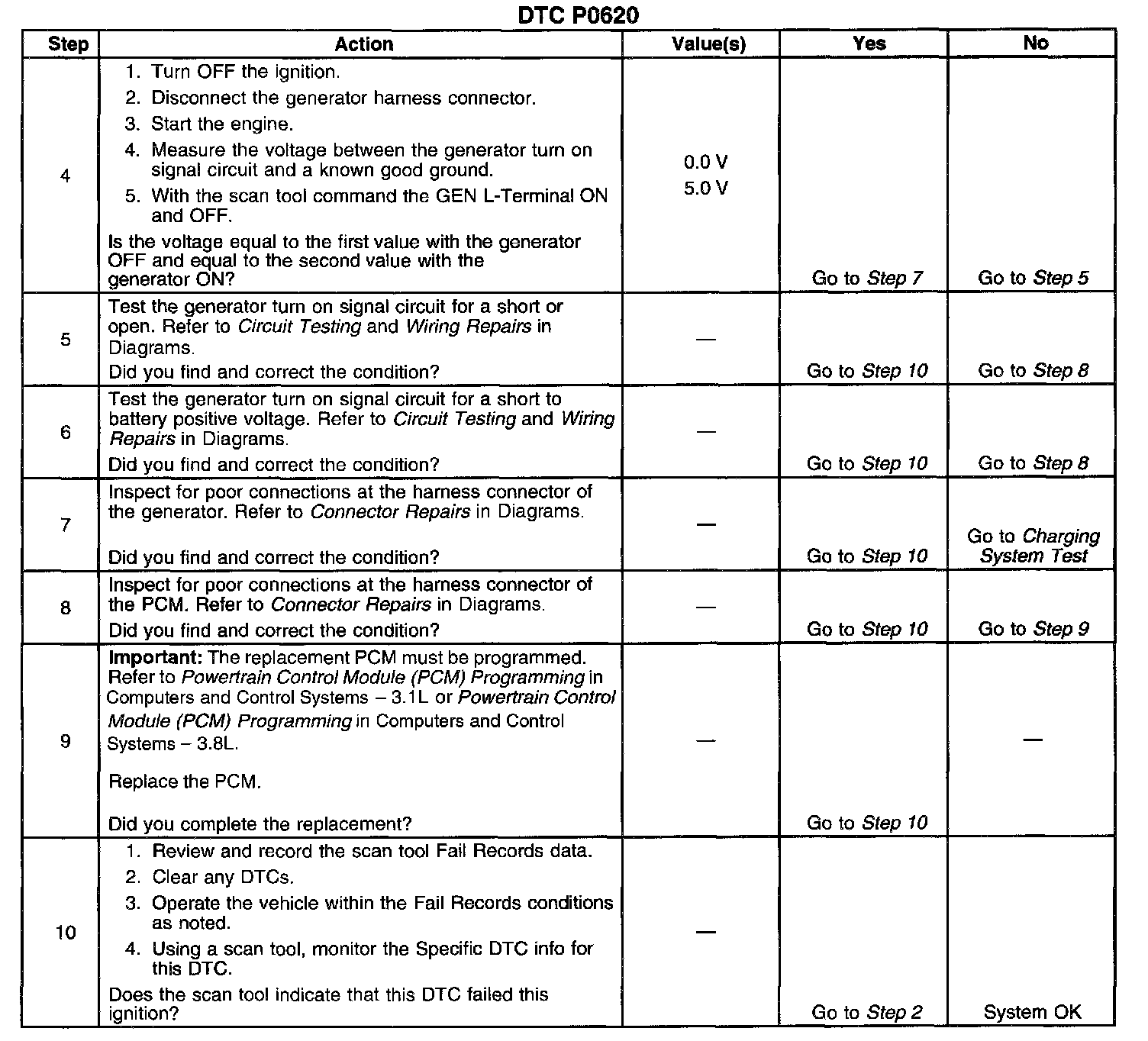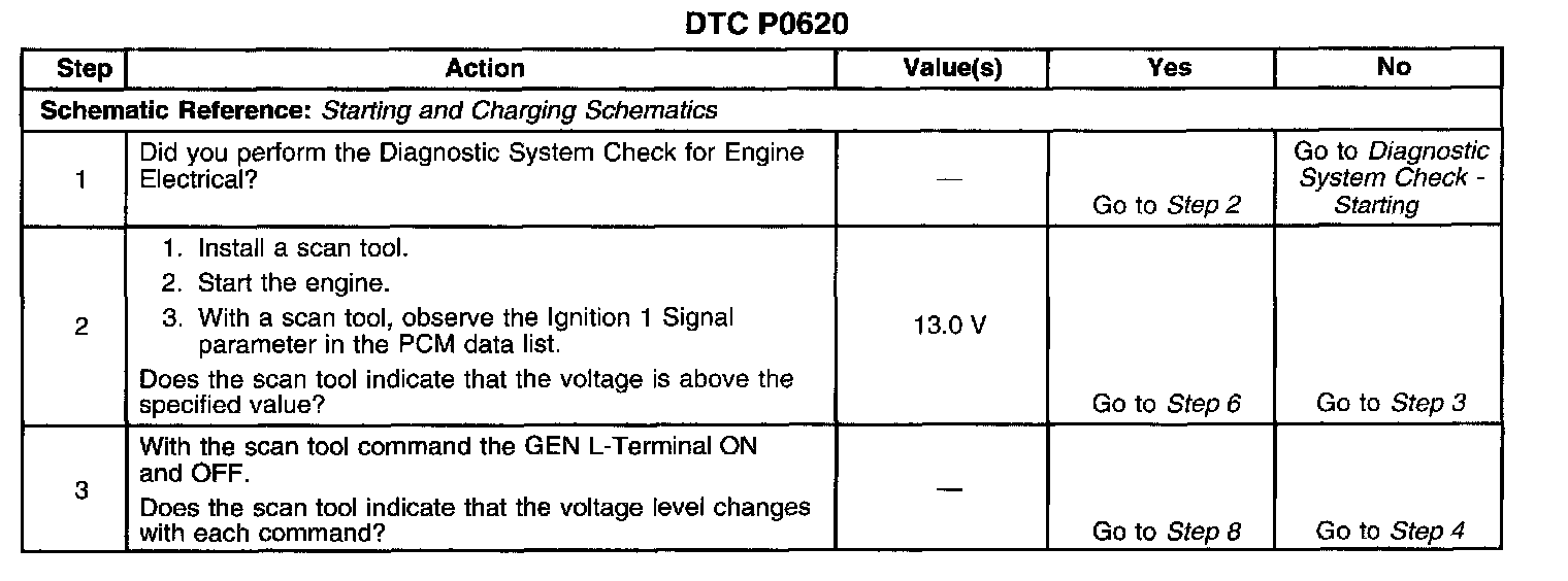 CIRCUIT DESCRIPTIONThe Powertrain Control Module (PCM) uses the generator turn on signal circuit to control the generator. A high side driver within the PCM allows the PCM to turn the generator ON and OFF. When Generator operation is desired, the PCM sends a 5 volt signal to the voltage regulator via the generator turn on signal circuit. This causes the voltage regulator to begin controlling the generator field circuit. Once the Generator is enabled by the PCM, the voltage regulator controls generator output independently of the PCM. Under certain operating conditions, the PCM can turn Off the generator by turning Off the 5 volt signal on the generator turn on signal circuit. The PCM has fault detection circuitry which monitors the state of the generator turn on signal circuit. If the fault detection circuit senses a voltage other than what is expected, this DTC will set. The voltage regulator also contains fault detection circuitry. If the regulator detects a problem, the regulator will ground the generator turn on signal circuit, pulling the voltage low. This also causes the PCM to set the DTC.