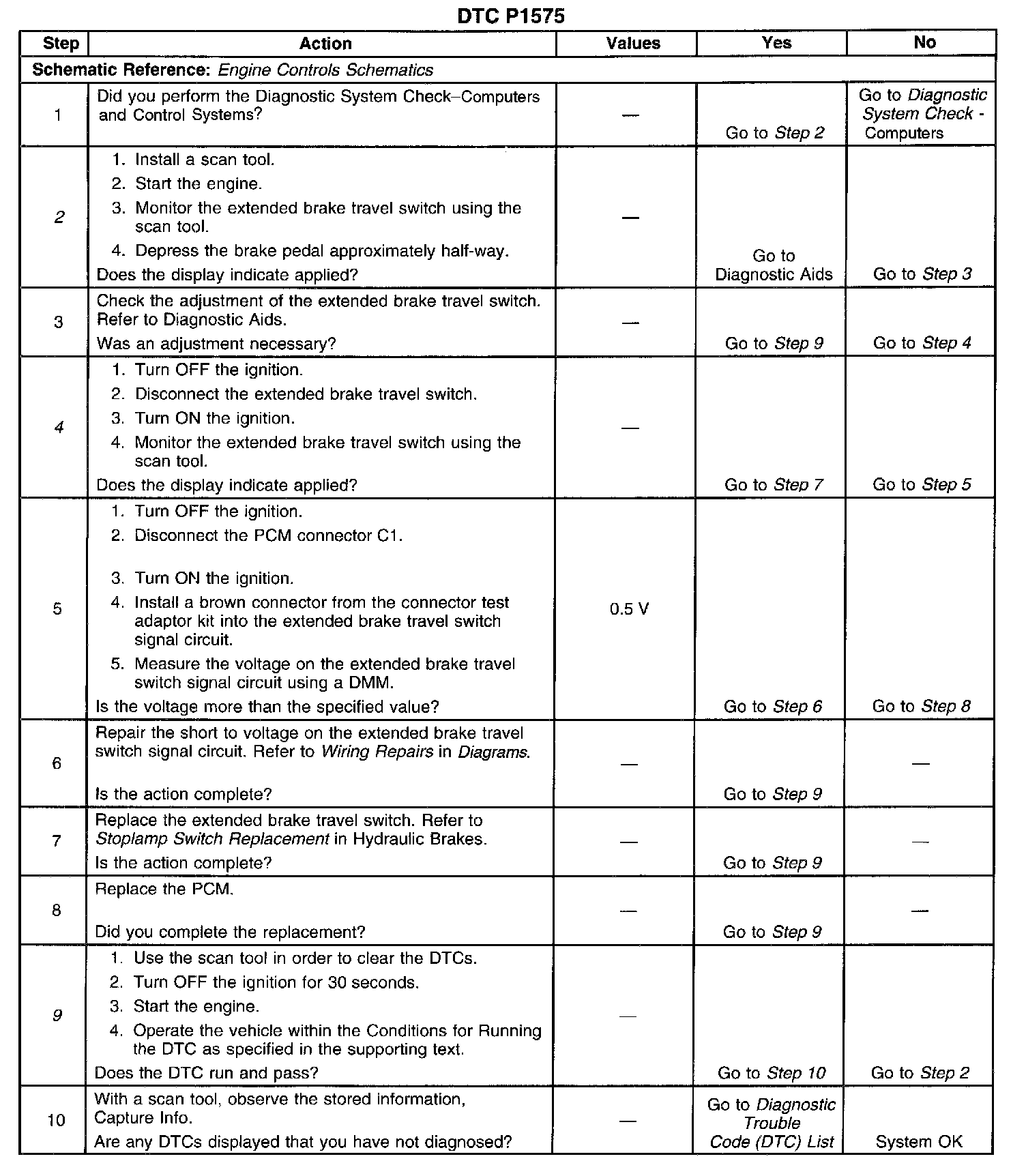If the PCM senses a voltage on the extended travel brake switch signal circuit when the extended travel brake switch should be open, DTC P1575 will set.