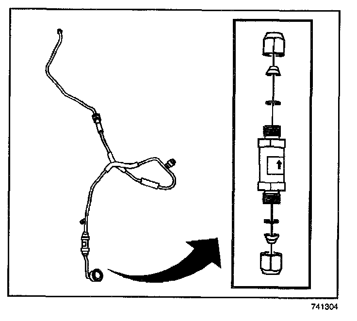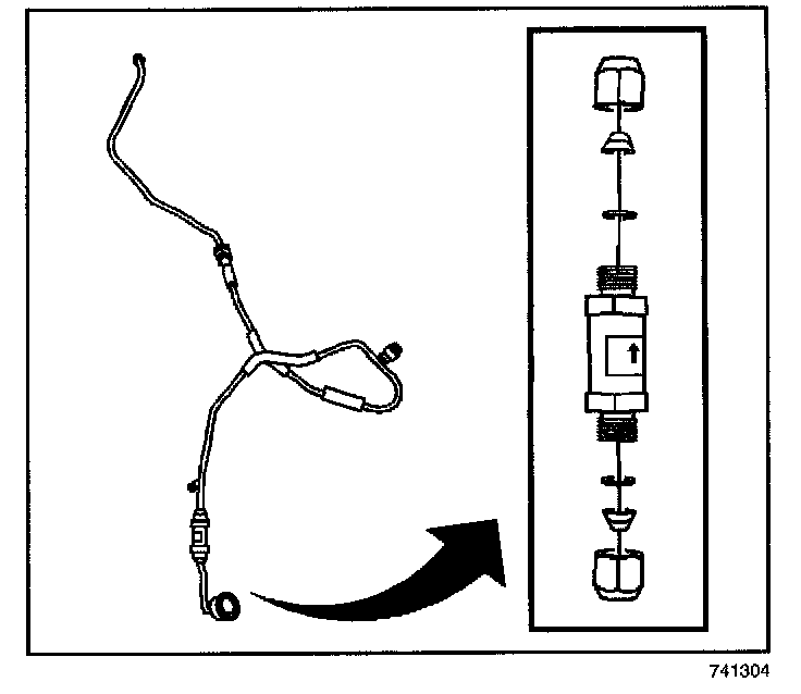 3. Install the A/C refrigerant filter to the evaporator tube with the arrow pointing toward the evaporator.