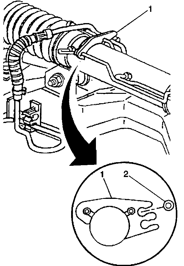 7. Remove the power steering pressure line (2) from the clamps (1) on the power steering gear.