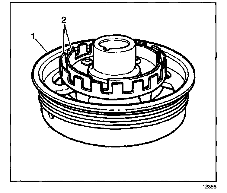 The rotating element is called an interrupter ring or blade. In this case there are two interrupter rings built into the crankshaft balancer. The outer ring and outer switch provides the Powertrain Control Module (PCM) with the 18x signals, or 18 pulses per crankshaft revolution. The inner ring and inner switch provide the PCM with a sync pulse three times per crankshaft revolution. The Ignition Control (IC) module uses the 18x and sync pulses to determine the engine position, by counting how many ON-OFF 18x pulses occur during a given sync pulse. Each of the 3 sync pulses represent a pair of cylinders both at top dead center at the same time, which are called companion cylinders. With this dual interrupter ring arrangement the IC module can identify the correct pair of cylinders to fire within as little as 120 degrees of crankshaft rotation.