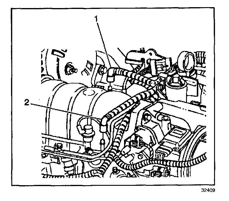 3. Disconnect the fuel teed, (1) and return pipes (2) from the fuel rail tubes. Refer to Quick Connect Fitting(s) Service (Metal Collar).