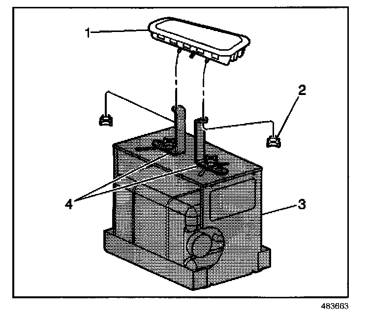 15. Connect the inflator module (1) to the adapter (2) on the SIR deployment harness (3).