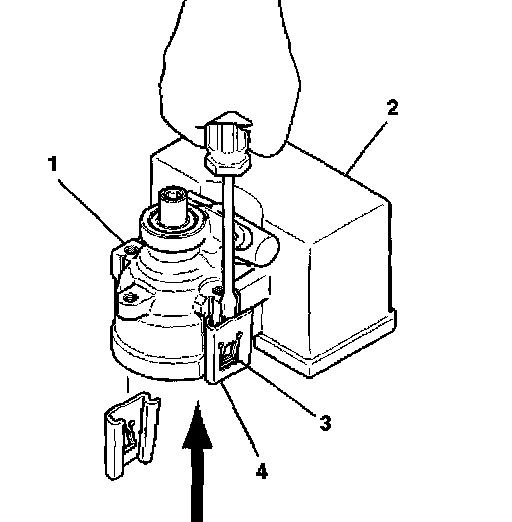4. Slide the reservoir clip (4) away from the hydraulic pump assembly (1).