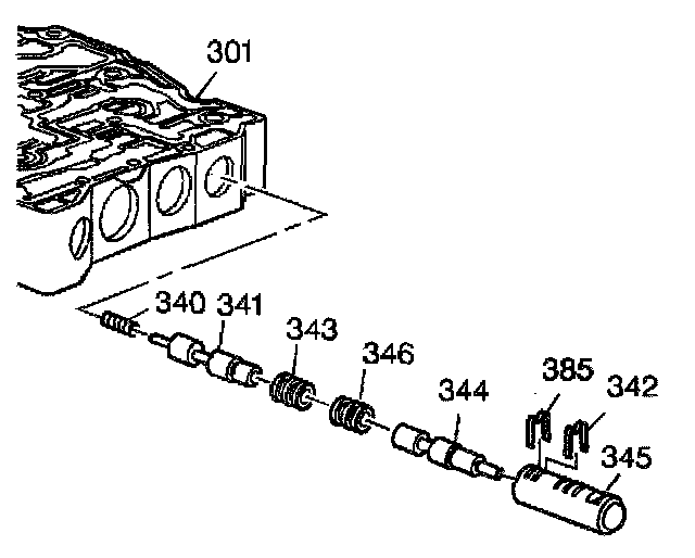 3. Install the 3-4 accumulator valve spring (340), the 3-4 accumulator valve (341) and the 2-3 accumulator valve bushing (345) into the control valve body (301).