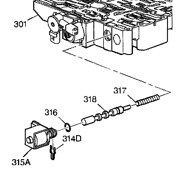 30. Hold the 1-2, 3-4 SS valve (315A) in the control valve body (301). Install the 1-2, 3-4 shift solenoid valve retainer (314D) into the control valve body (301).