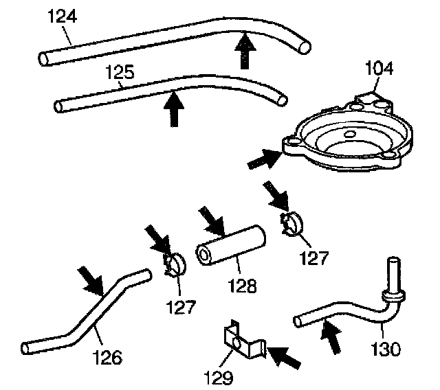 12. Assemble the lube oil pipe (126), hose (128), hose clamps (127), pipe retainer (129) and pipe with washer (130).
