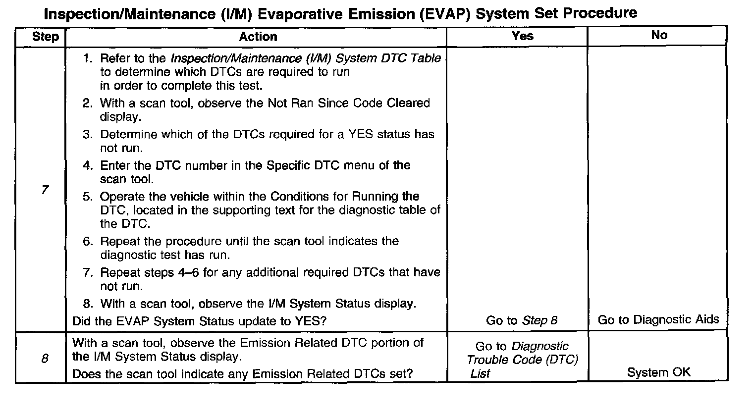 6. This step identifies a first failure of a type B DTC. A DTC only appears on the I/M System Status display when the DTC becomes a MIL illuminating DTC. This occurs on the second failure of a type B DTC. A first failure of a type B DTC will not allow the I/M System Status to update to YES. Refer to Diagnostic Aids.