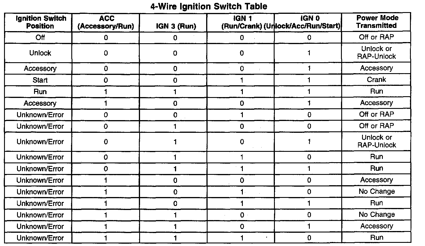 4-Wire Ignition Switch Table: