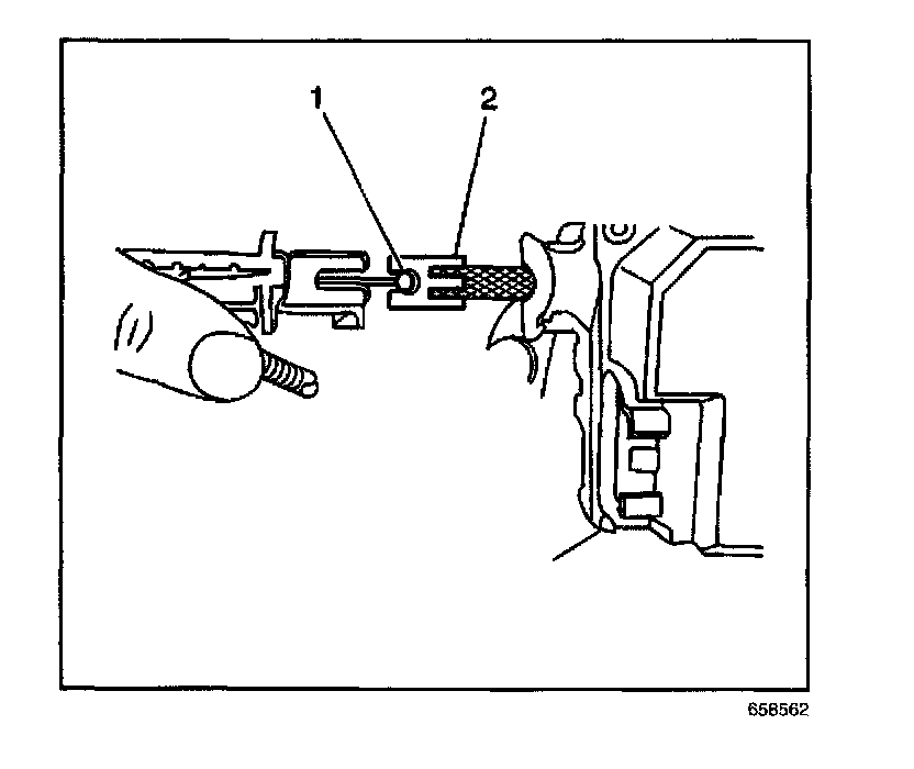 1. Install the cruise control cable ball stud (1) into the slot in the cruise control module actuator strip (2).