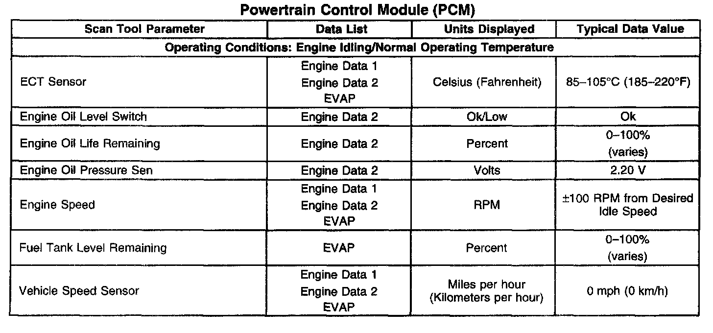 Scan Tool Data List - Powertrain Control Module (PCM)