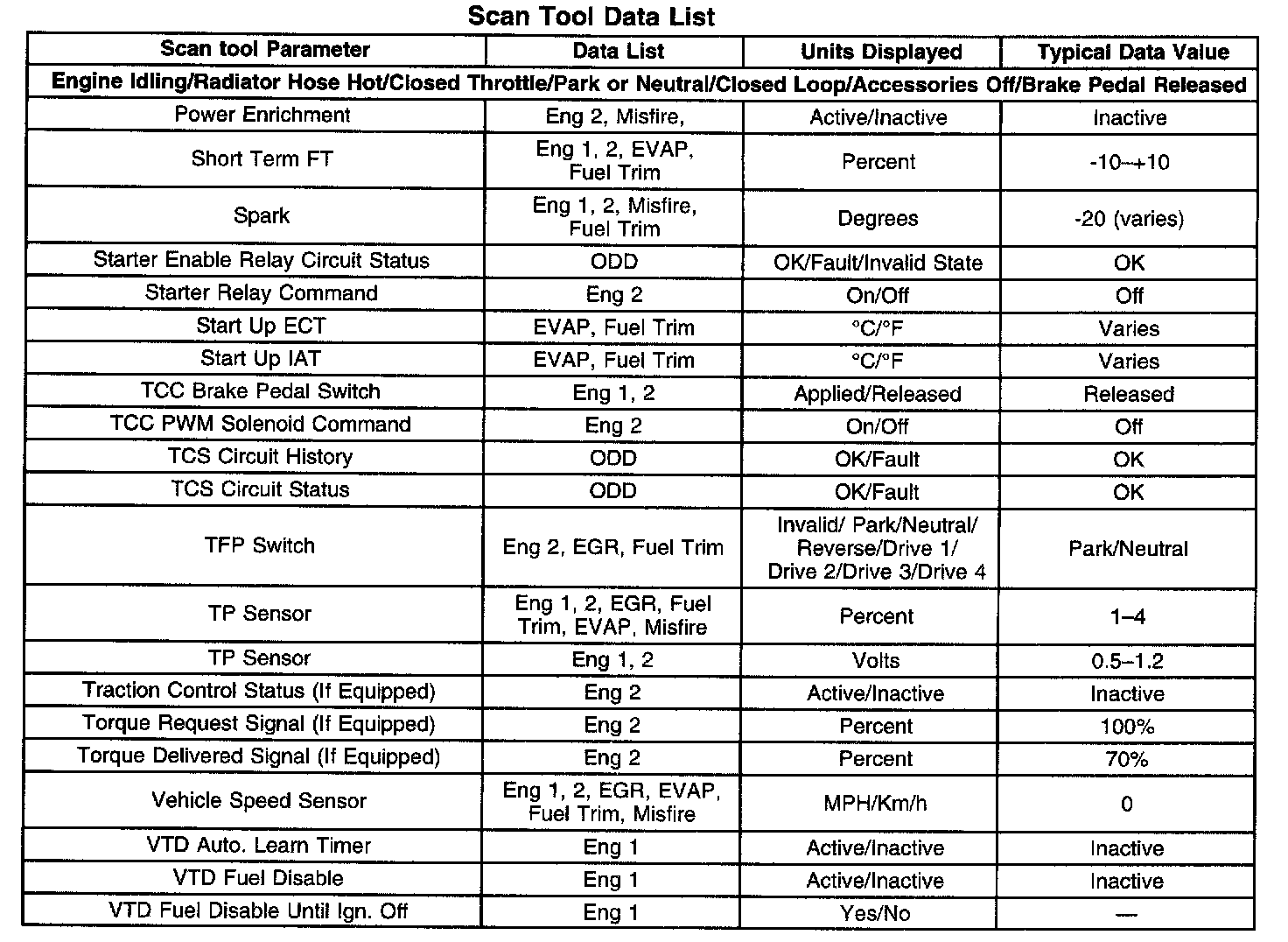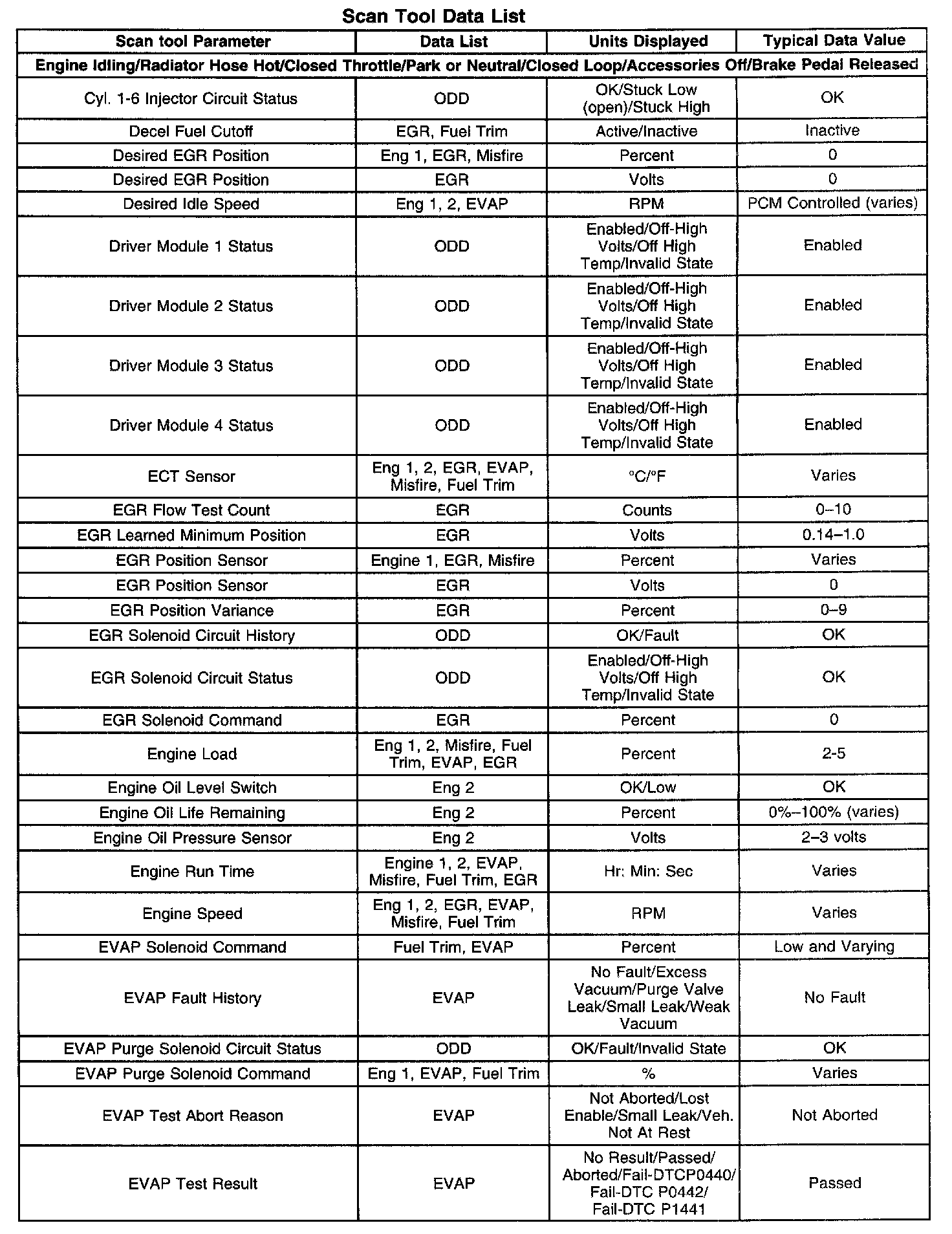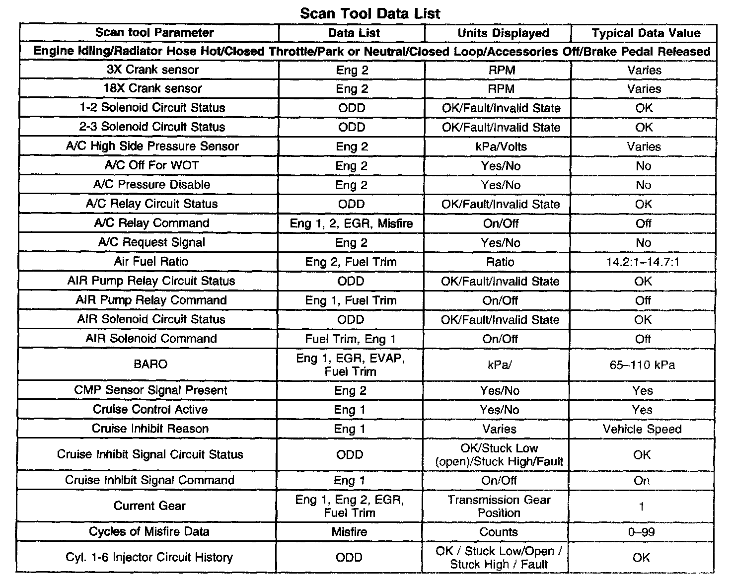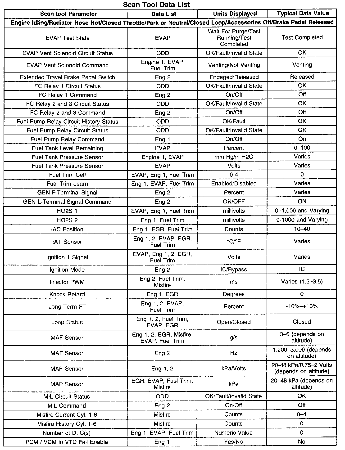 The Engine Scan Tool Data List contains all engine related parameters that are available on the scan tool. The list is arranged in alphabetical order. A given parameter may appear in any one of the data lists, and in some cases may appear more than once, or in more than one data list in order to group certain related parameters together.