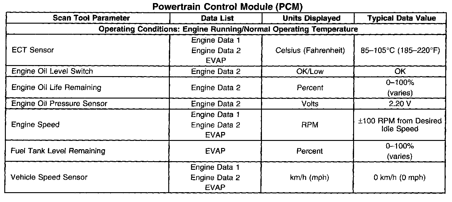 Scan Tool Data List - Powertrain Control Module (PCM)