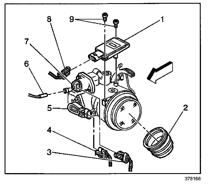 4. Remove the screws (9) that hold the MAF sensor to the throttle body.