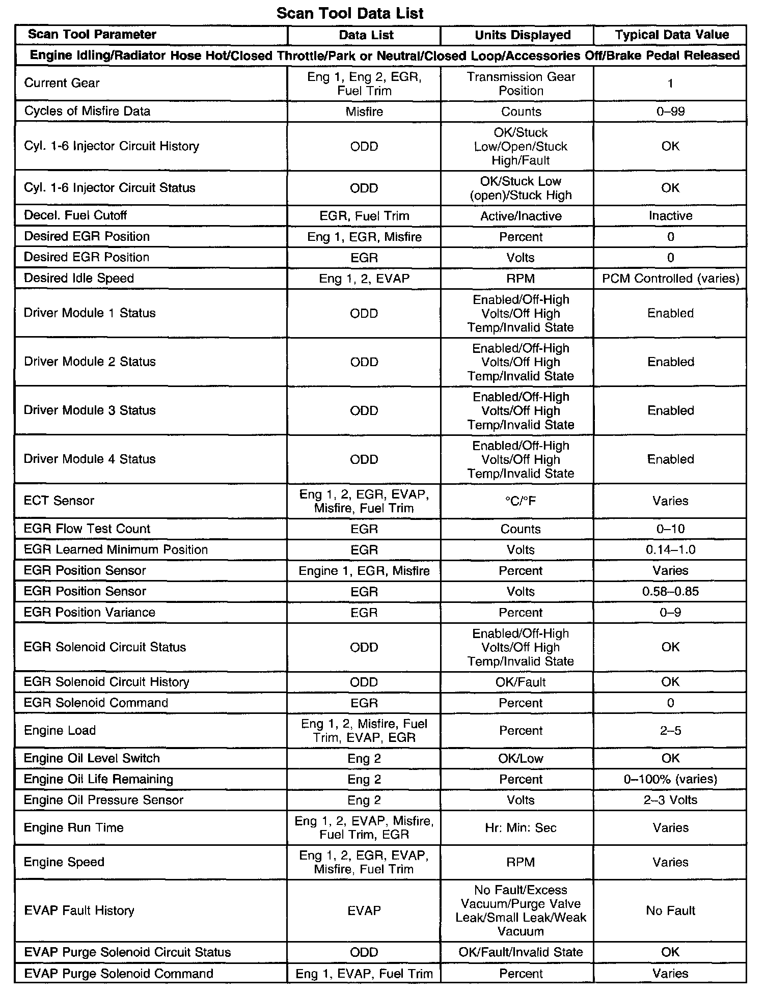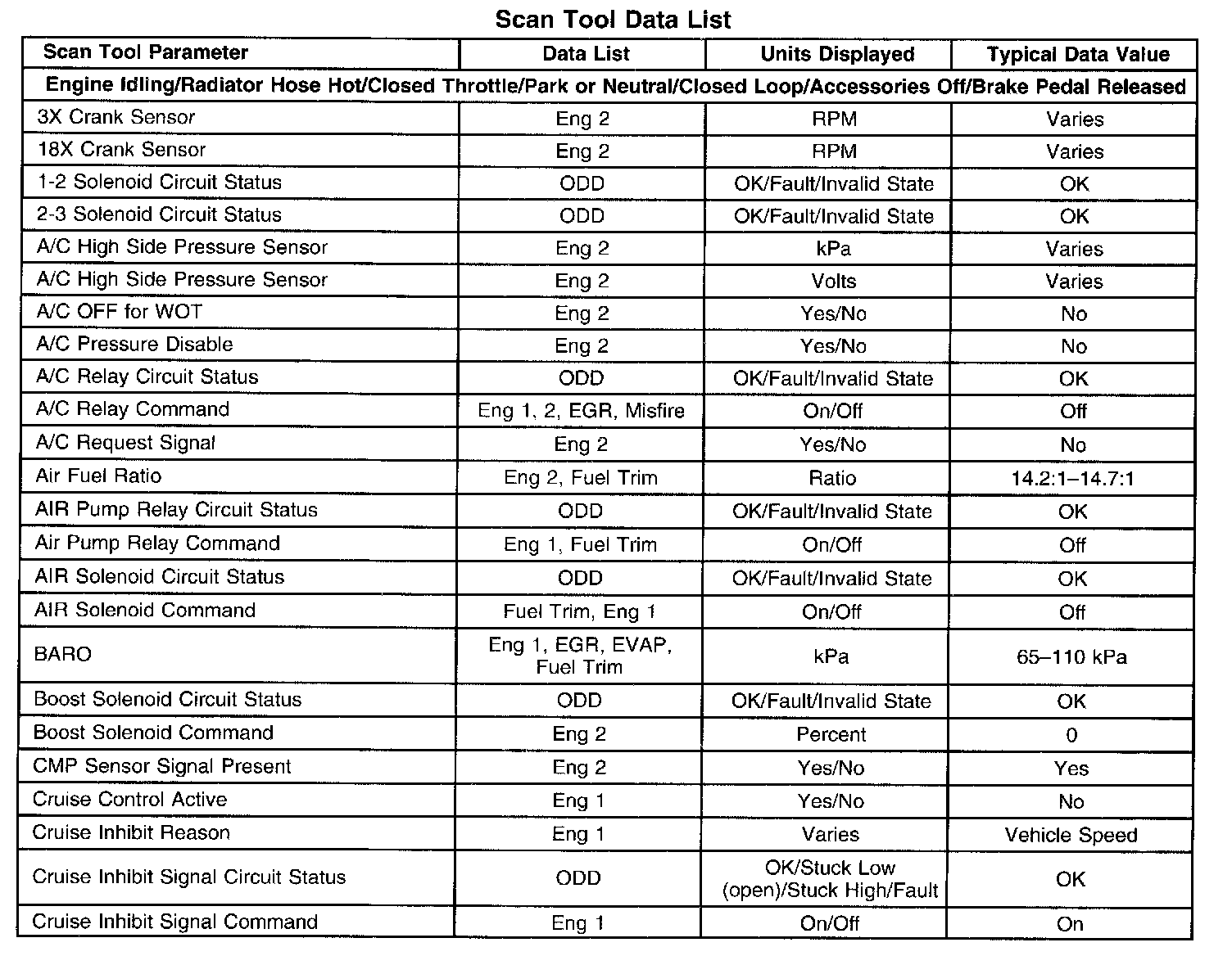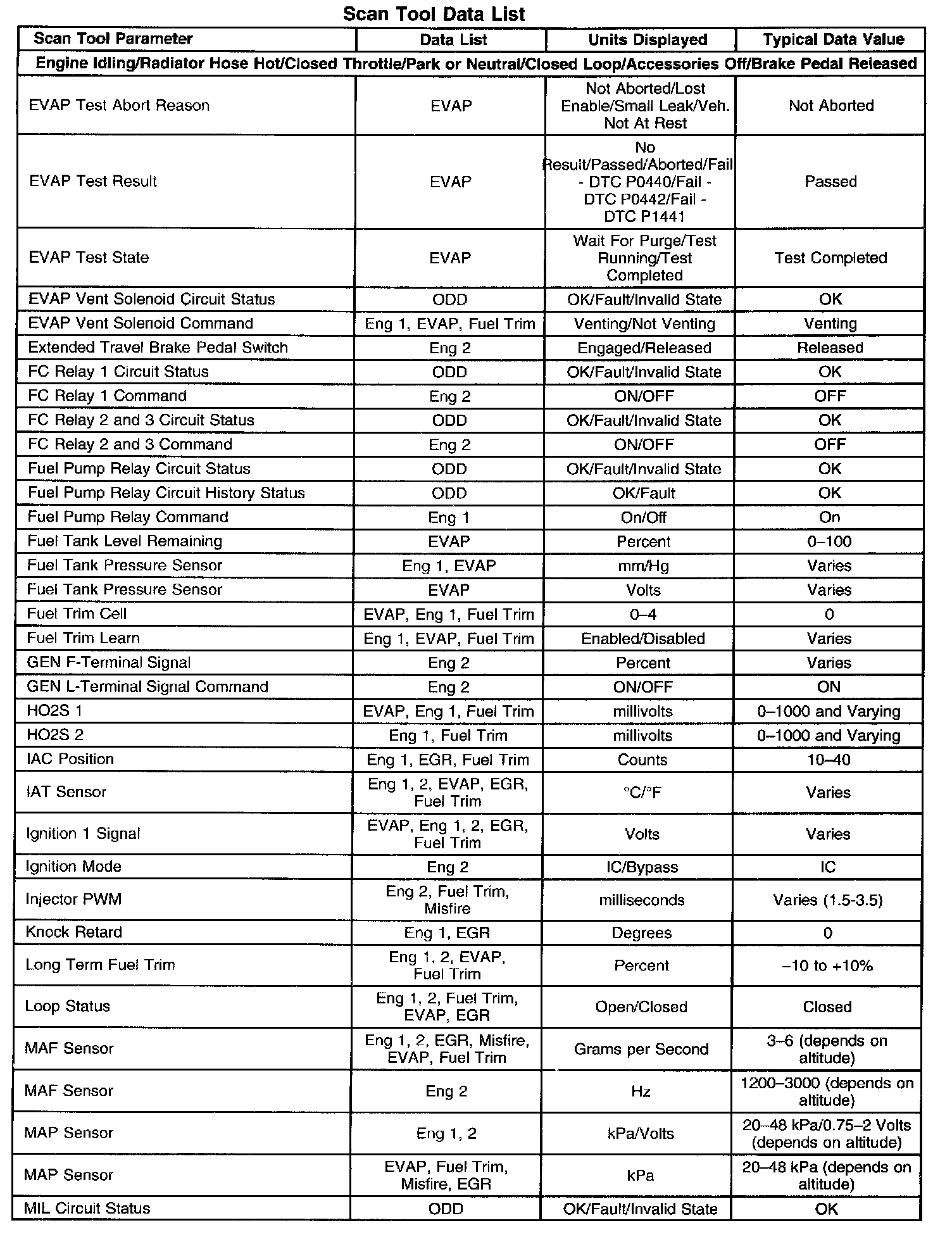 Scan tool values from a properly running engine may be used for comparison with the engine you are diagnosing. The Engine Scan Tool Data List represents values that would be seen on a normally running engine.