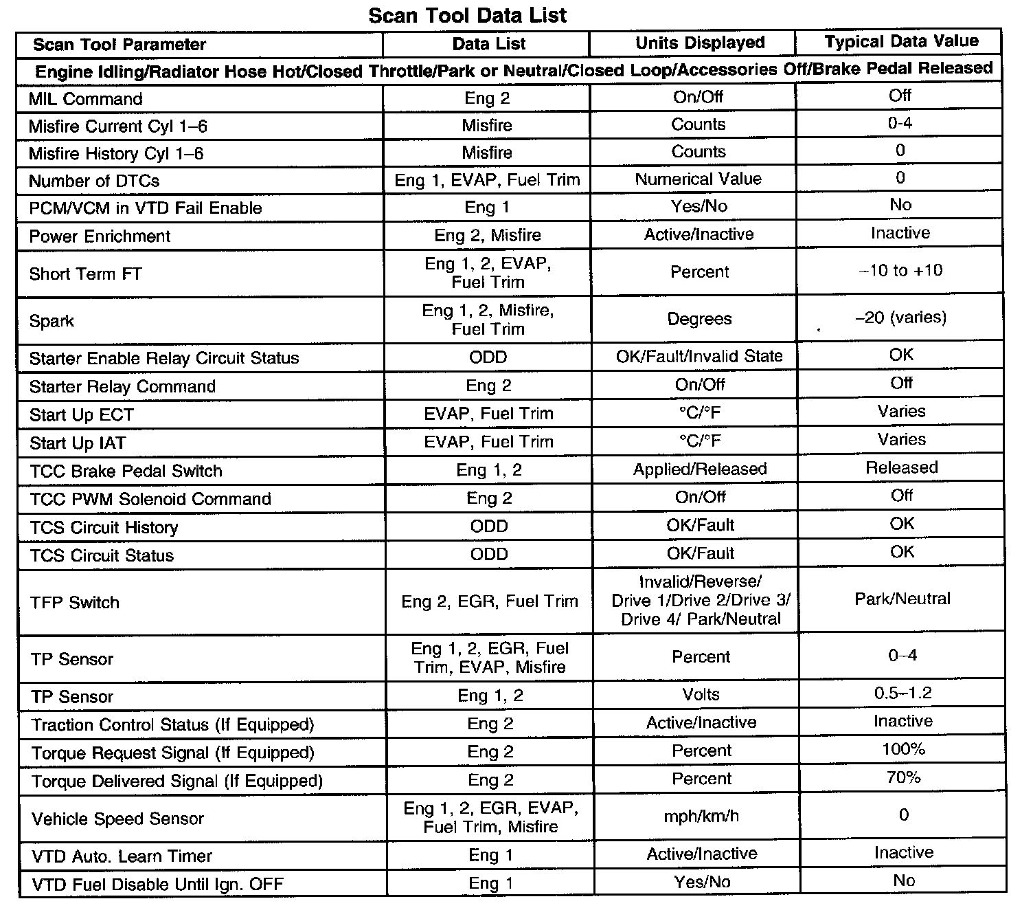 The column labeled Data List indicates where a parameter can be located on the scan tool. Refer to the scan tool operating for the exact locations of the data lists. The following is a description of each term listed: