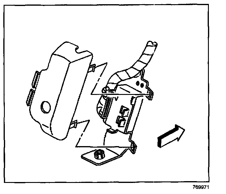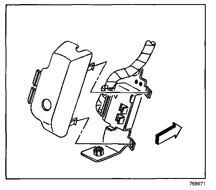 10. Slide the plastic bracket assembly inboard, under the metal bracket. Remove the plastic bracket assembly from the metal bracket.