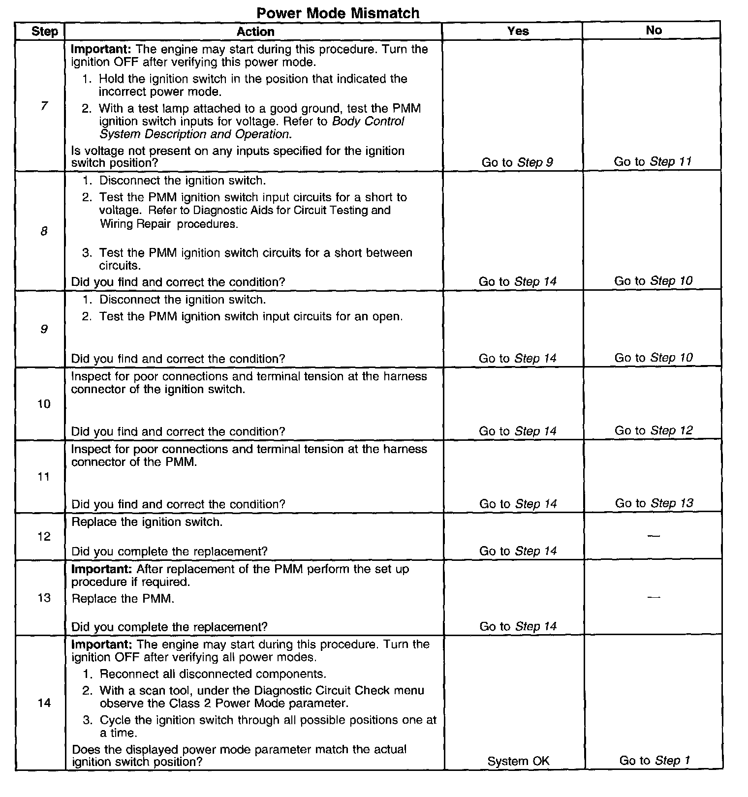 CIRCUIT DESCRIPTIONNormal vehicle class 2 communications and module operations will not begin until the system power mode has been identified. Discrete wires from the ignition switch contacts are monitored by the power mode master (PMM) module in order to determine the correct power mode. The PMM communicates the system power mode to all class 2 modules on the class 2 serial data line. Refer to Body Control System Description and Operation to identify which module is the PMM and the applicable power mode look up table.