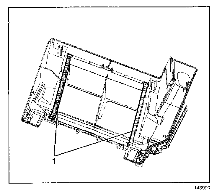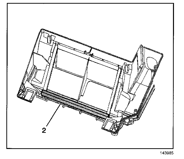 13. Remove and discard the seals (1,2) from the heater core cover.
