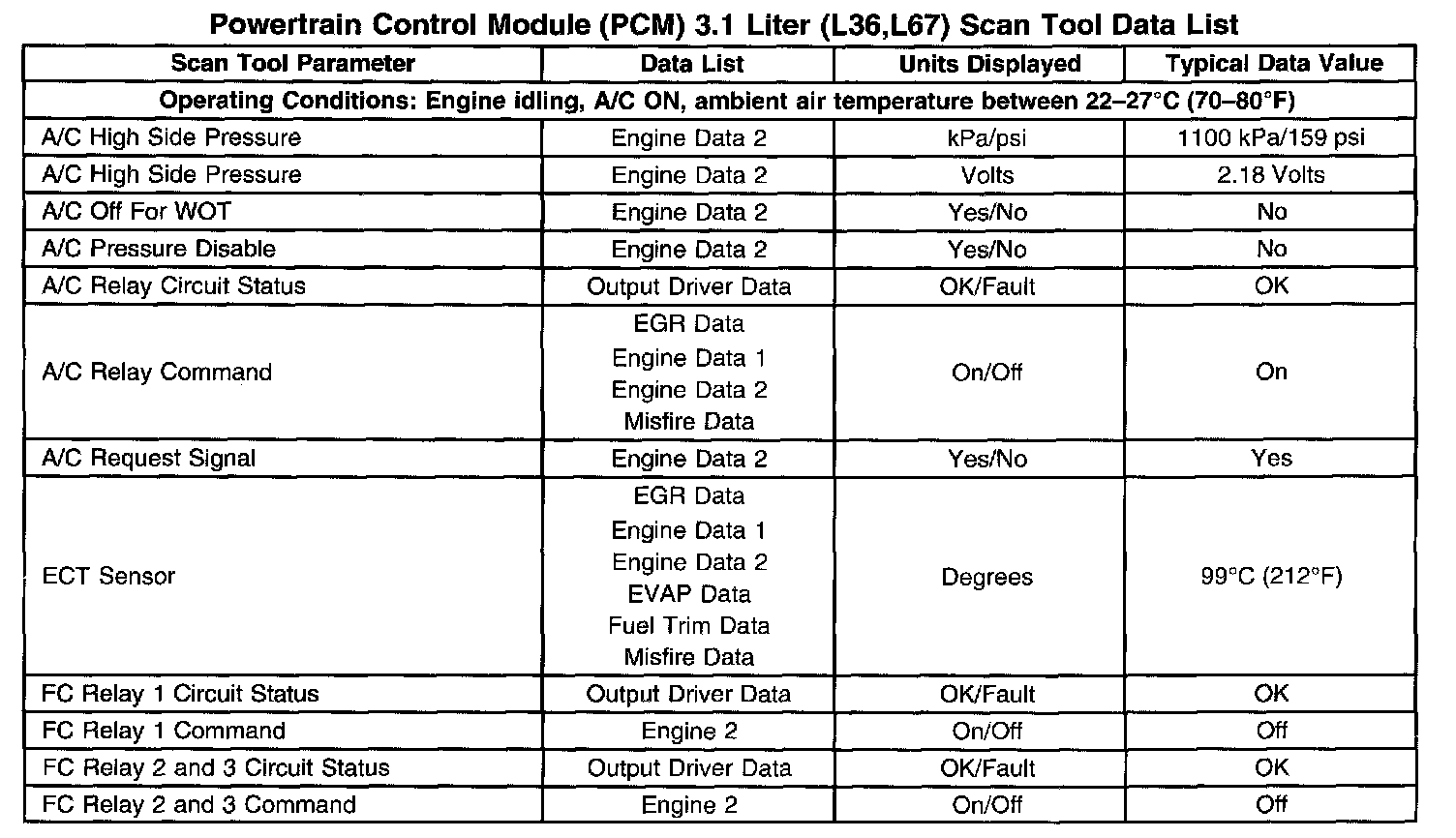 Powertrain Control Module (PCM) 3.1 Liter (L36,L67) Scan Tool Data List: