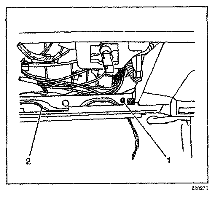 6. Remove the wiring harness retainer (1) from the passenger knee bolster bracket (2).