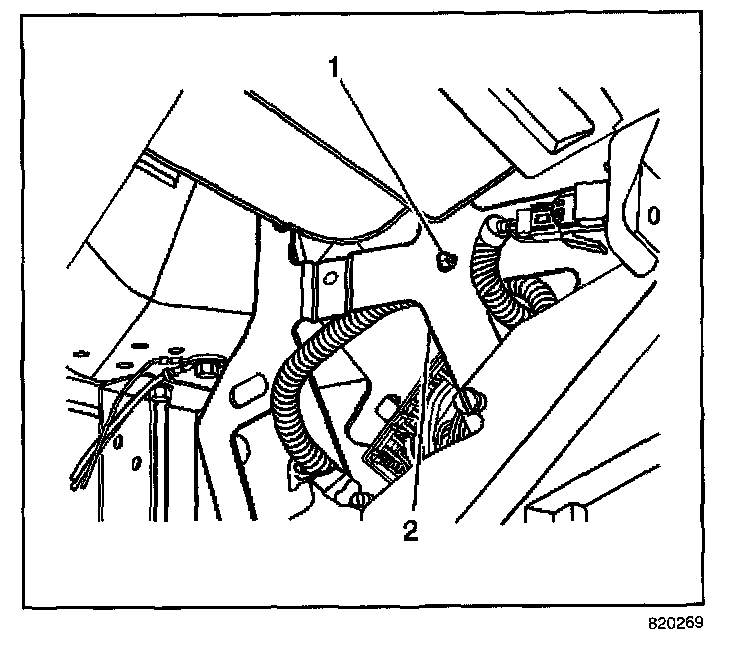 5. Remove the lamp harness retainer (1) from the passenger knee bolster bracket (2).