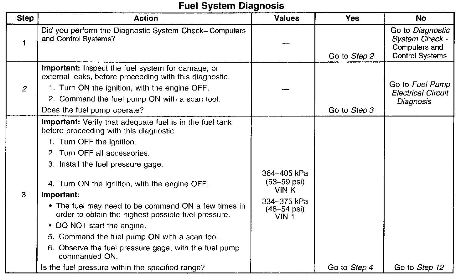 14. This step tests for a restricted fuel return pipe. If the fuel pressure is within the specified values, a restriction in the fuel return pipe is indicated.