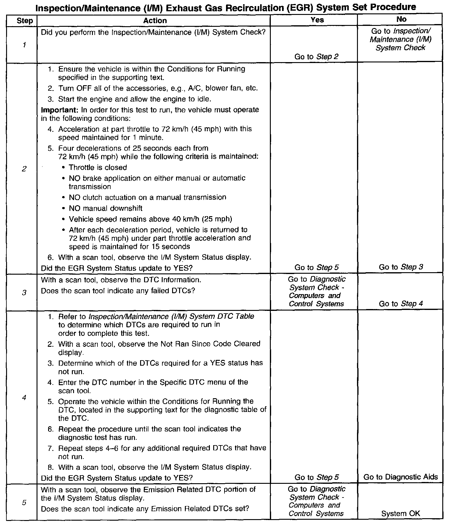 The control module only runs the EGR Active Tests during a gradual deceleration with a closed throttle and a vehicle speed above 40 km/h (25 mph). Several deceleration cycles may be necessary in order to accumulate a sufficient number of EGR flow samples. The procedure outlined in the table is for a clear, flat road. If the procedure is performed on a road with a slight down hill grade, the test may acquire the necessary sample counters in one or two decel trips. If the test is interrupted during the procedure, it may take more than three deceleration cycles to complete the test. If the status does not update, the test outlined in this procedure can be repeated until the I/M System Status updates to YES.