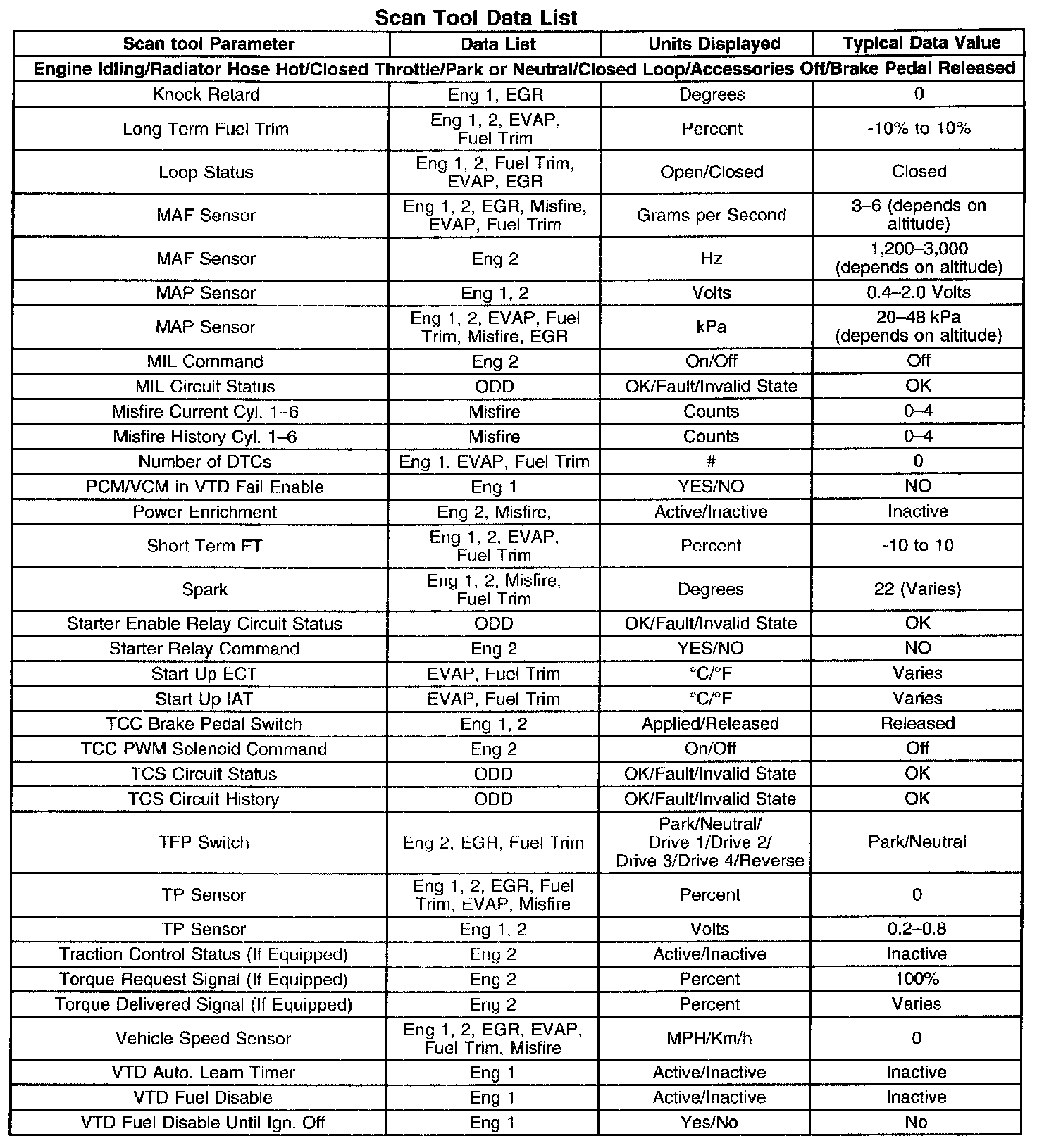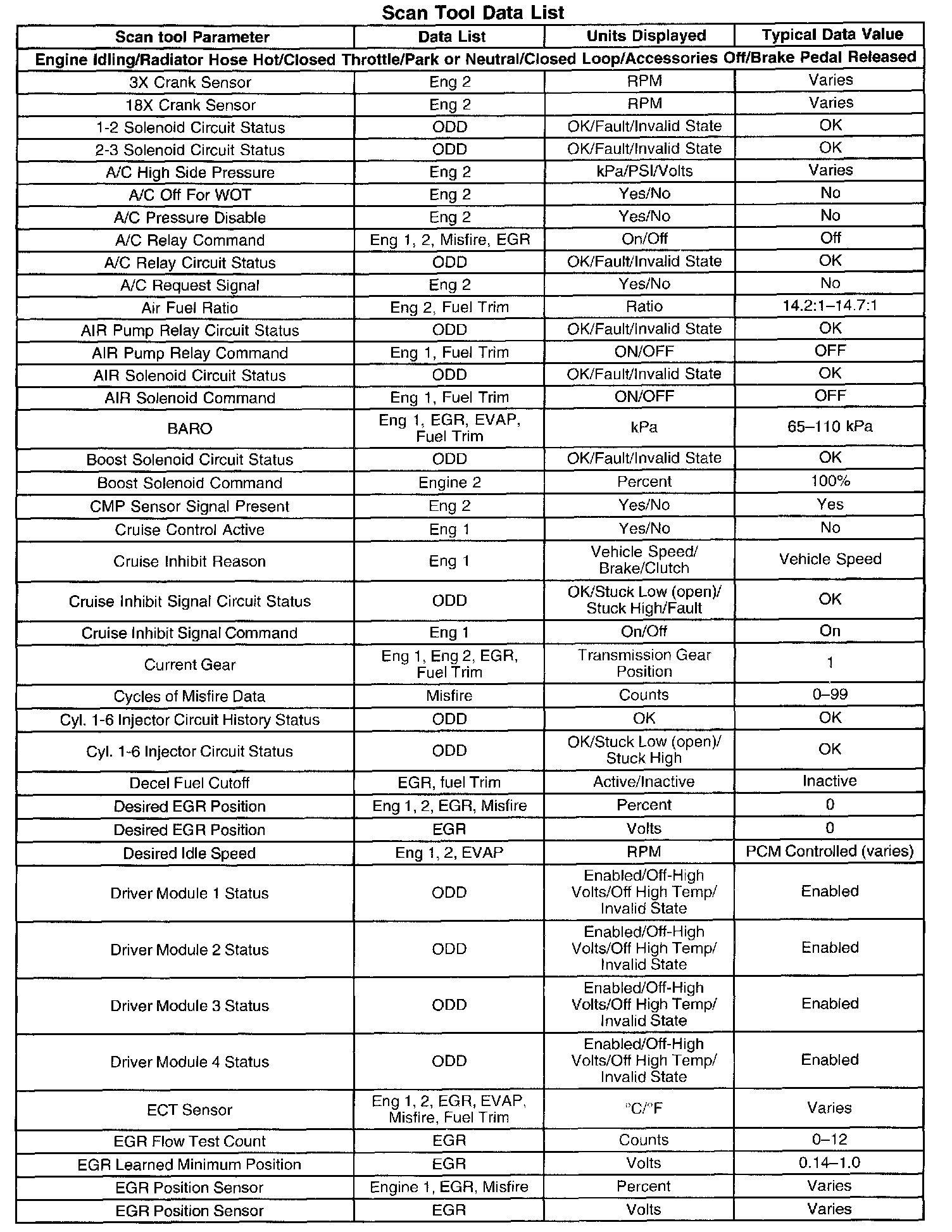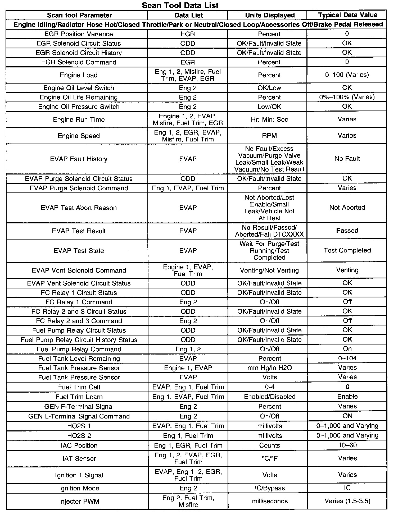 The Engine Scan Tool Data List contains all engine related parameters that are available on the scan tool. The list is arranged in alphabetical order. A given parameter may appear in any one of the data lists and in some cases may appear more than once, or in more than one data list in order to group certain related parameters together.