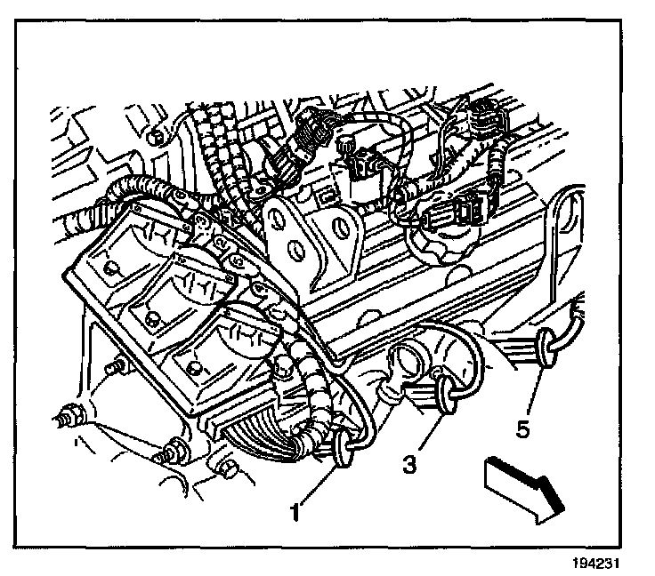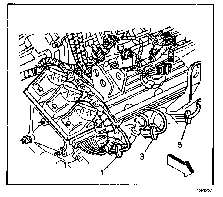 4. Install the spark plug wires (1, 3, 5) to the spark plugs in the proper position at the front of the engine.