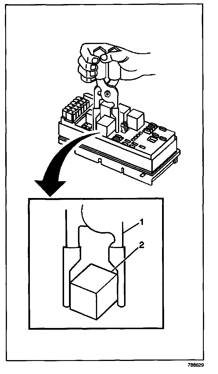 3. Using the J 43244 (1) position the tool on opposing corners of the relay (2).