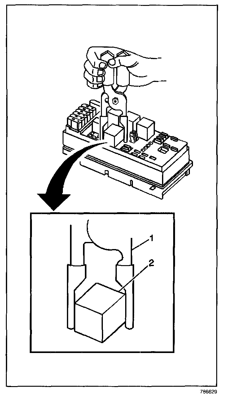 NOTE: Use J 43244 to pull the relay straight out from the electrical center terminals. The use of pliers or a flat bladed tool could damage the electrical center.