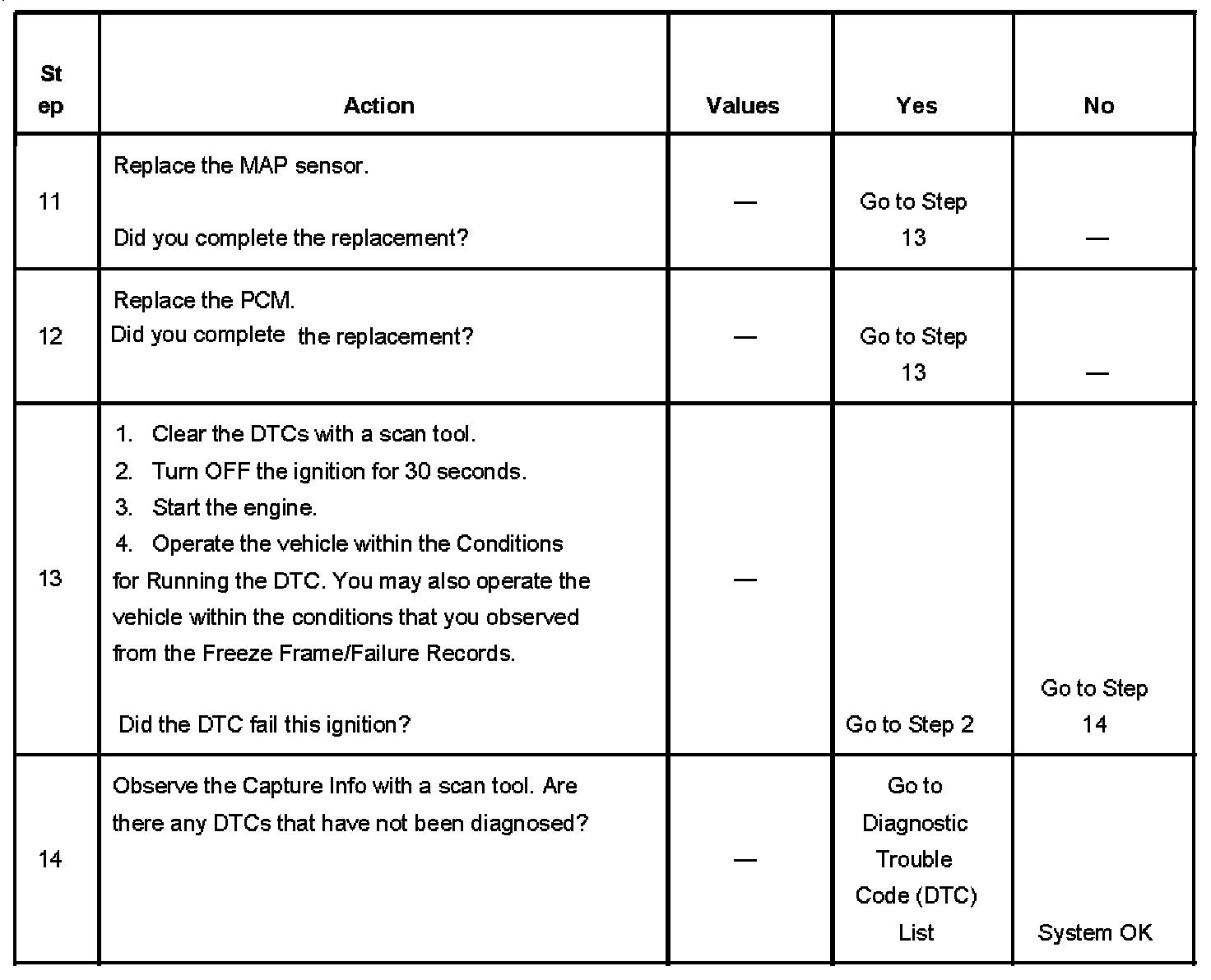 The numbers below refer to the step numbers on the diagnostic table.
