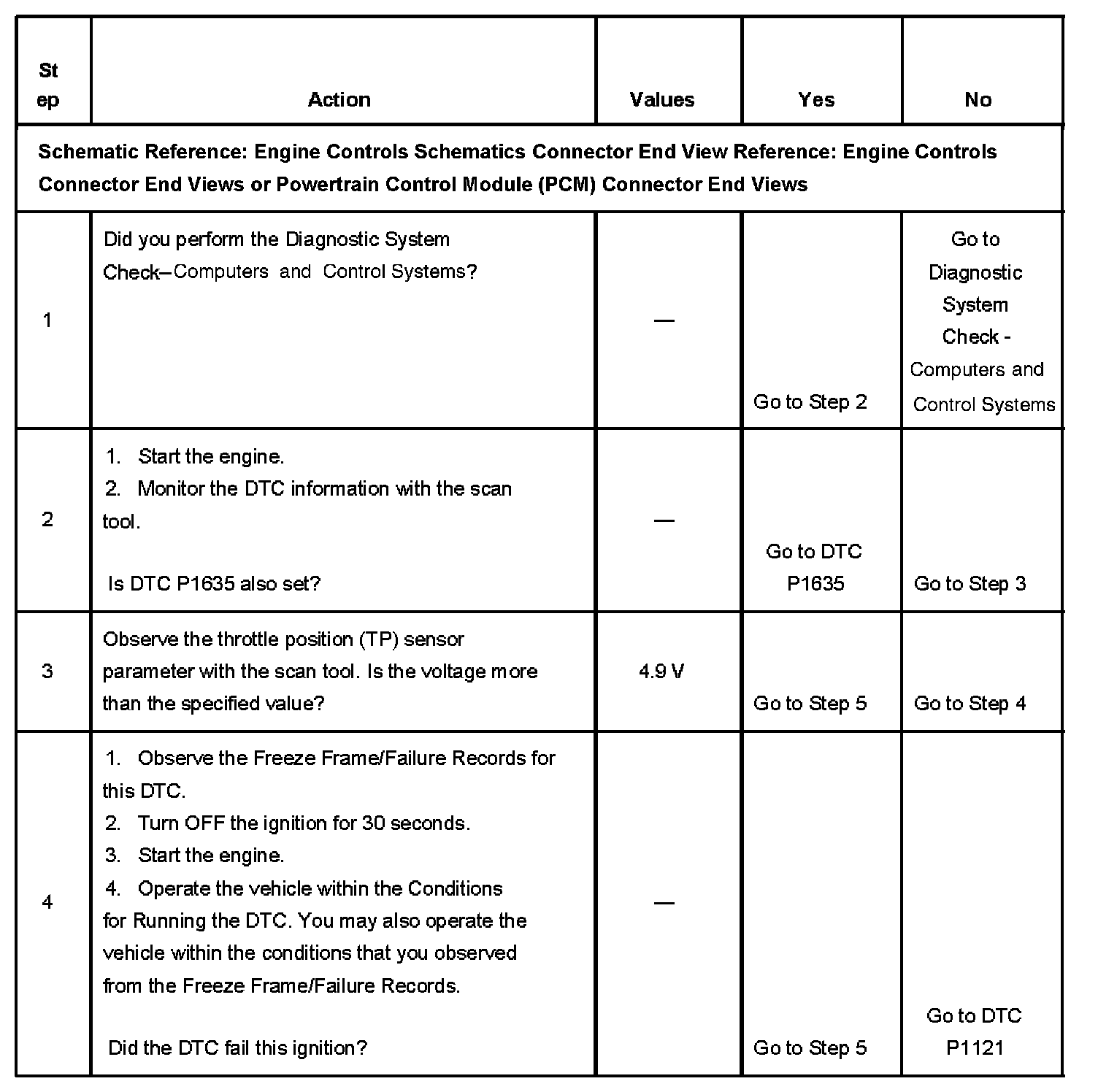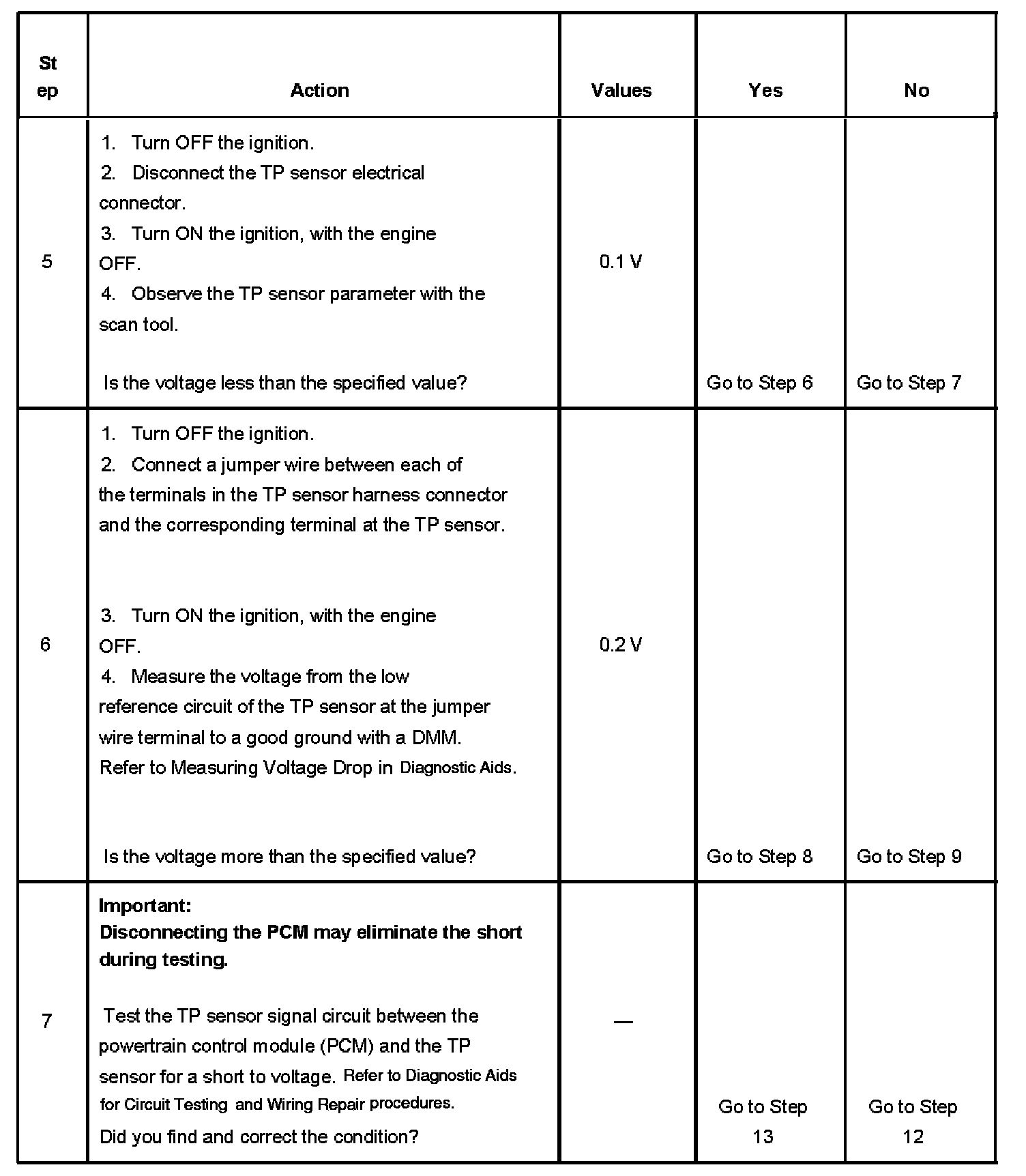 The PCM provides the TP sensor with 5 volts on the 5-volt reference circuit and a ground on the low reference circuit. Rotation of the TP sensor rotor from the closed throttle position to the wide open throttle (WOT) position provides the PCM with a signal voltage from less than 1.0 volt to greater than 4.0 volts through the TP sensor signal circuit. If the PCM detects an excessively high TP sensor signal voltage, DTC P0123 sets.