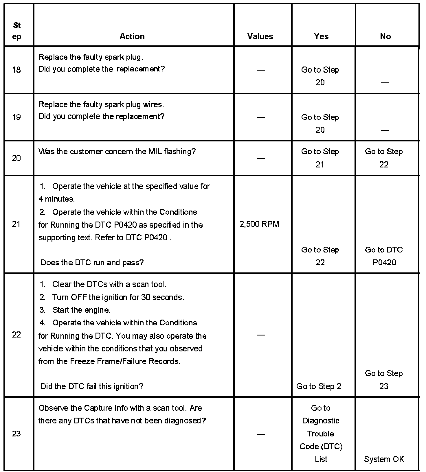 SYSTEM DESCRIPTIONThe powertrain control module (PCM) uses information from the ignition control (IC) module and the camshaft position (CMP) sensor in order to determine when an engine misfire is occurring. By monitoring variations in the crankshaft rotation speed for each cylinder, the PCM is able to detect individual misfire events. A misfire rate that is high enough can cause the 3-way catalytic converter (TWC) to overheat under certain driving conditions. The malfunction indicator lamp (MIL) will flash ON and OFF when the conditions for TWC overheating are present. If the PCM detects a misfire rate sufficient to cause emission levels to exceed mandated standards, DTC P0300 will set.