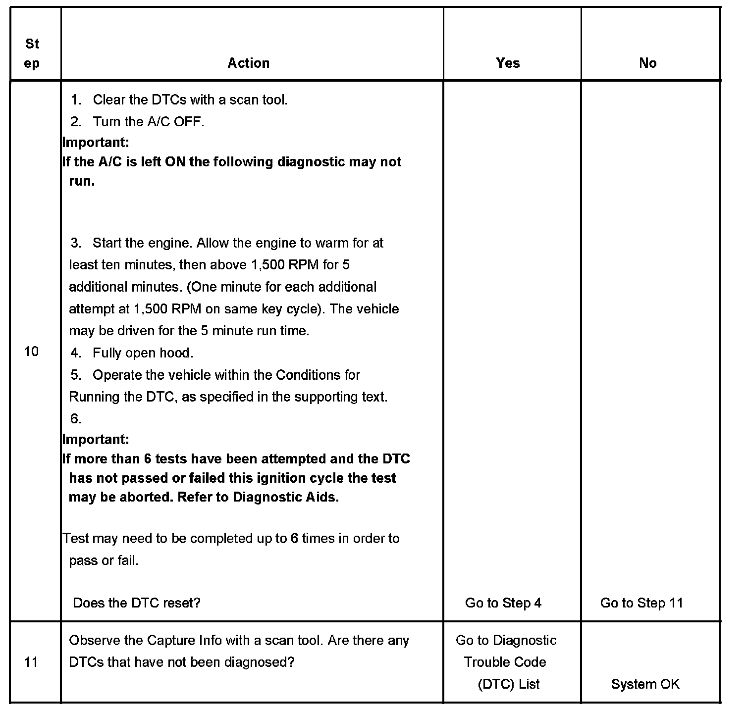 - If 18 tests have been attempted, and a decision has not been made this key cycle, turn the key OFF for 30 seconds. Start the vehicle and perform the conditions for running the DTC, including the 10 minute engine run time.