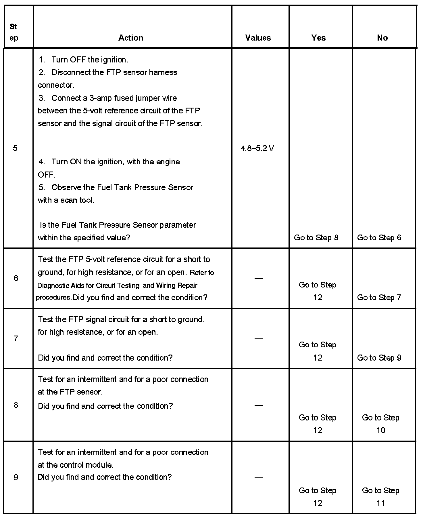 The fuel tank pressure (FTP) sensor measures the difference between the air pressure or vacuum in the evaporative emission (EVAP) system, and the outside air pressure. The control module supplies a 5-volt reference and a low reference circuit to the FTP sensor. The FTP sensor signal circuit voltage varies depending on EVAP system pressure or vacuum. If the FTP sensor signal voltage goes below a calibrated value, this DTC sets.