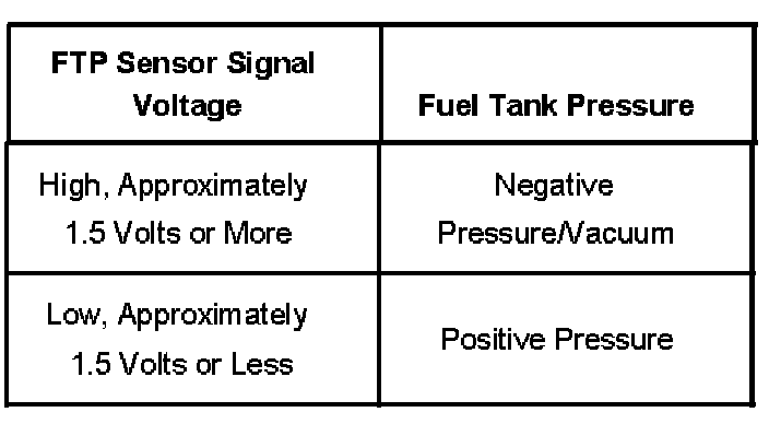 The table illustrates the relationship between FTP sensor signal voltage and the EVAP system pressure/vacuum.
