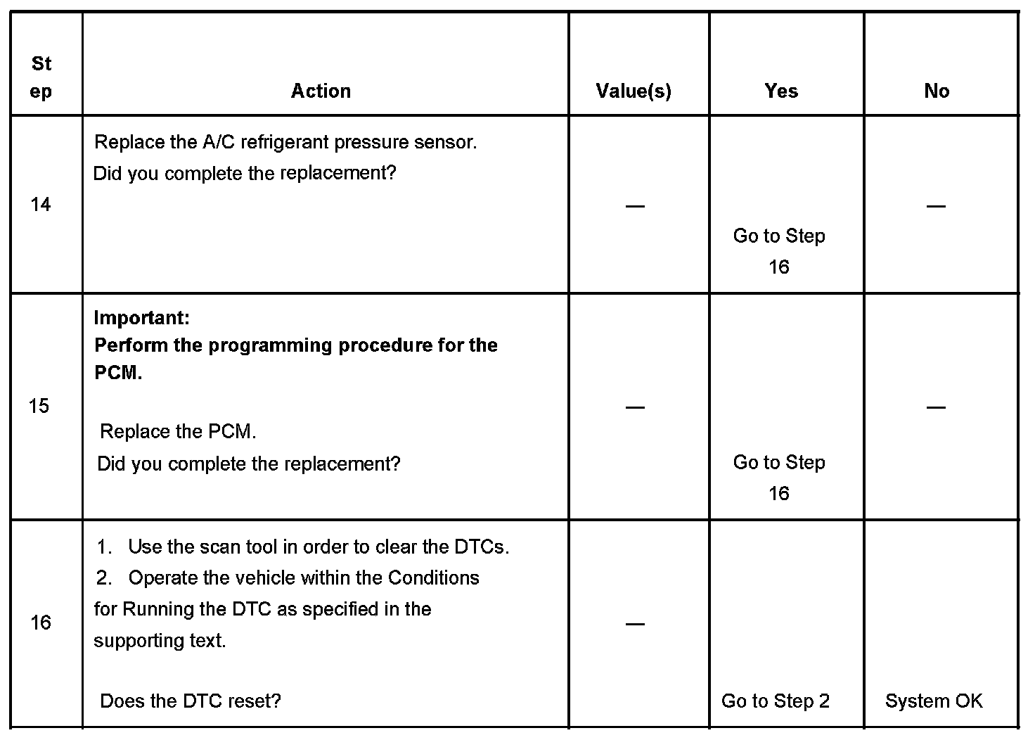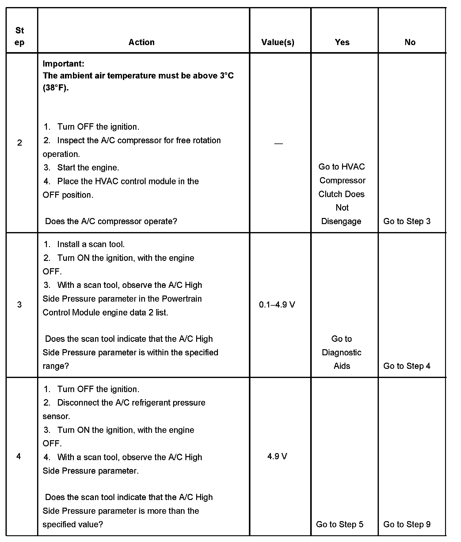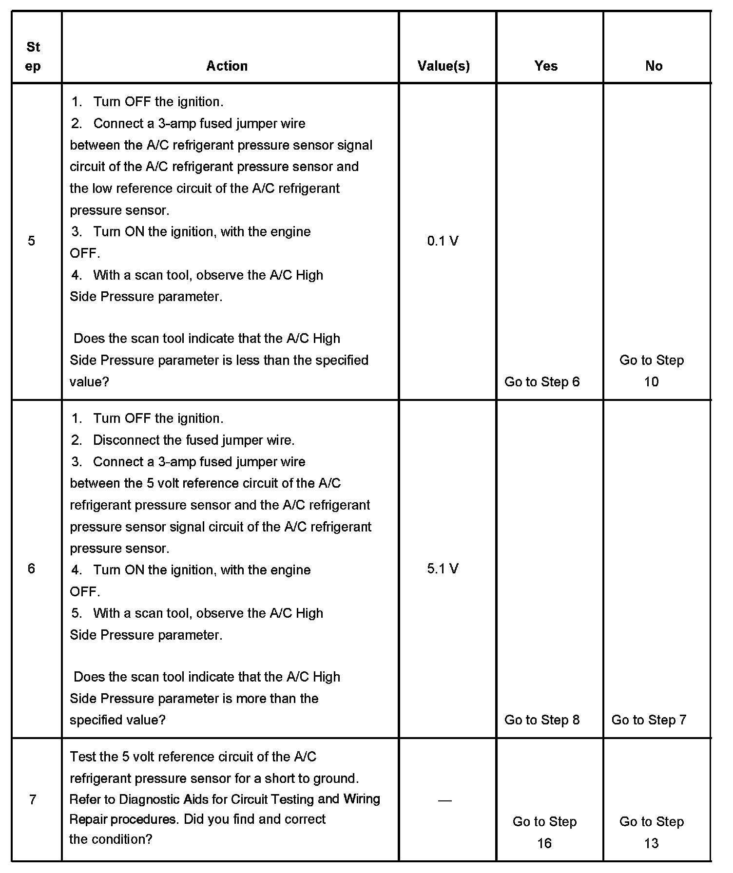 The numbers below refer to the step numbers on the diagnostic table.