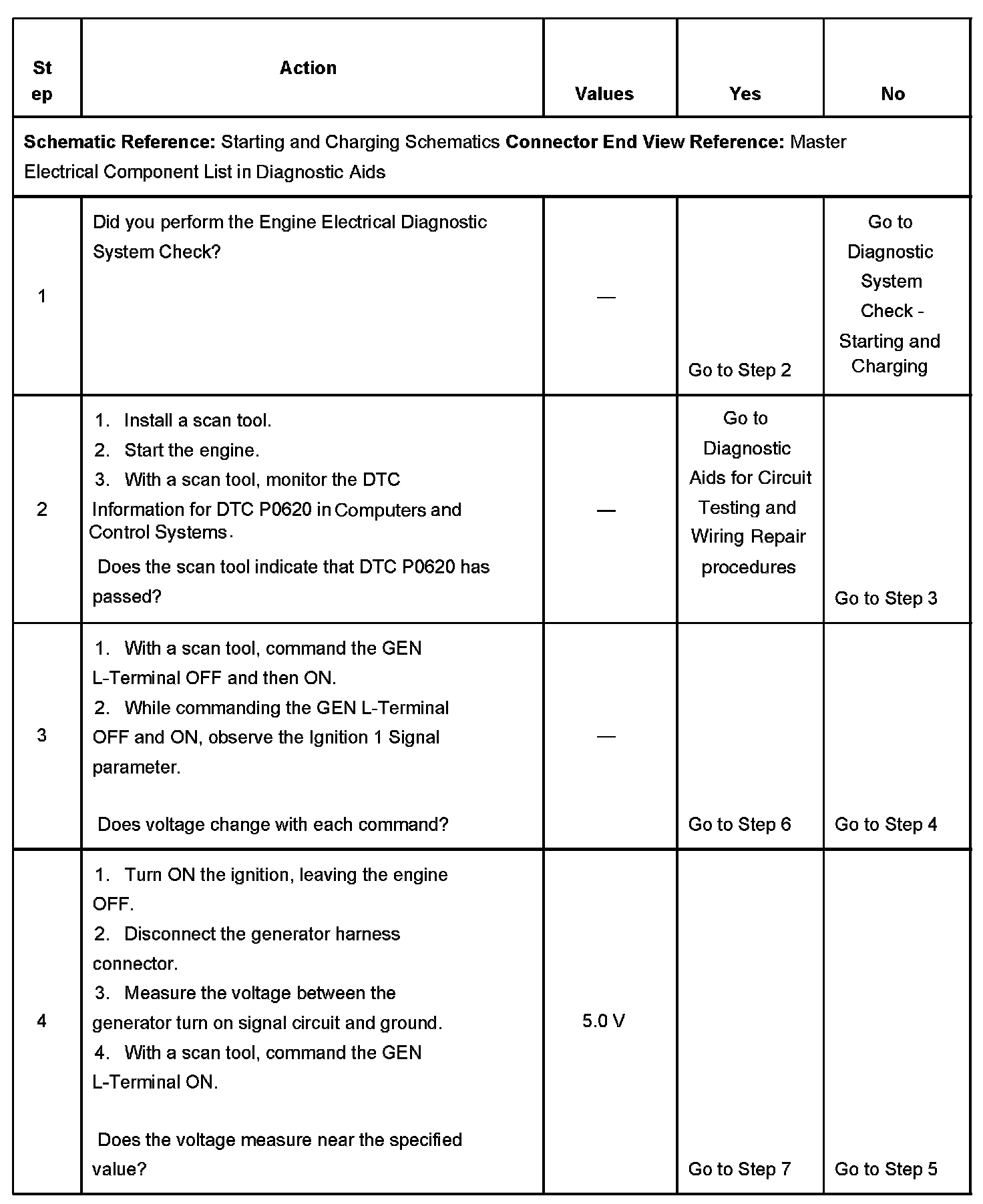 - The generator turn on signal circuit voltage is low while the PCM is commanding the generator on.
