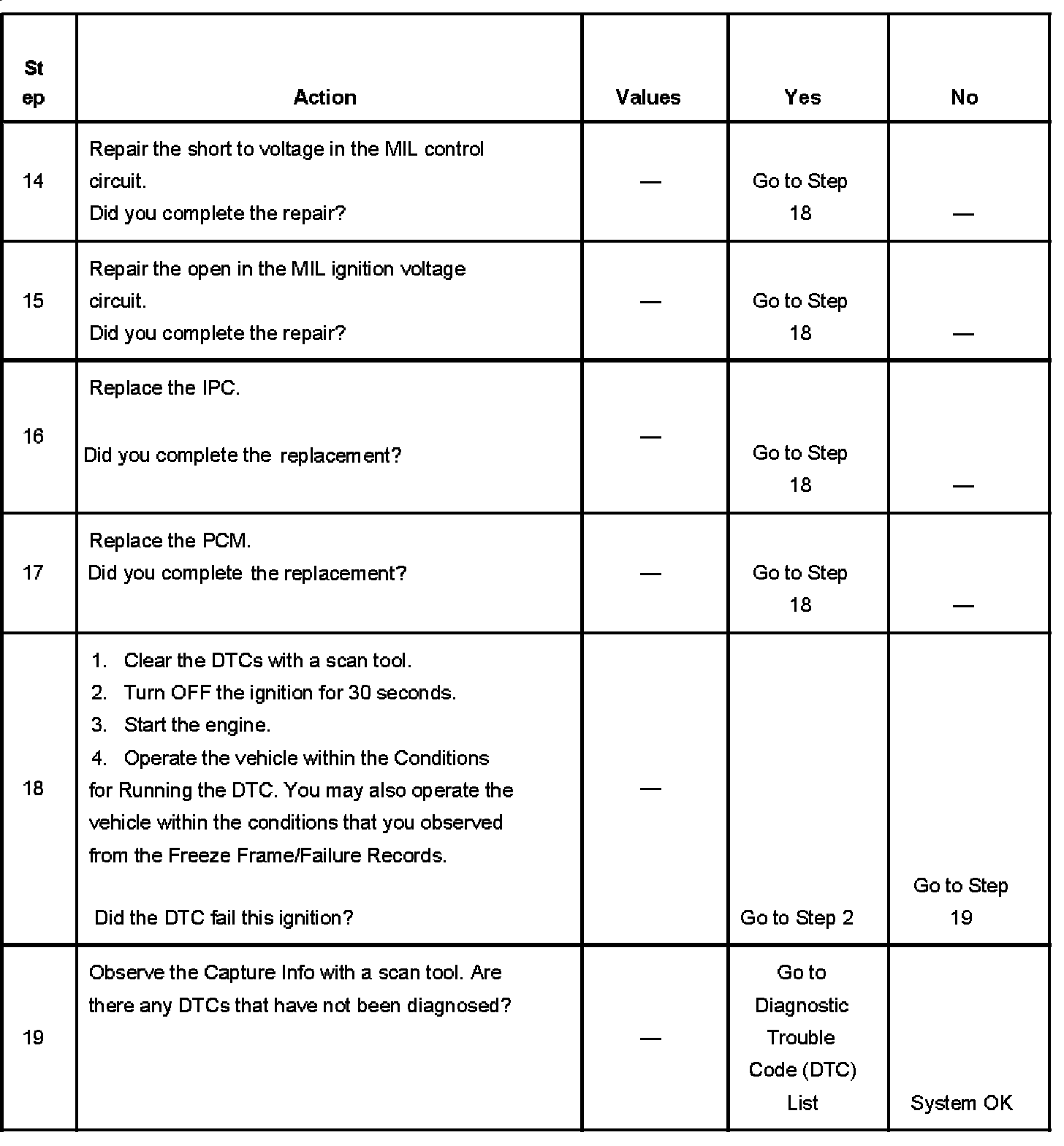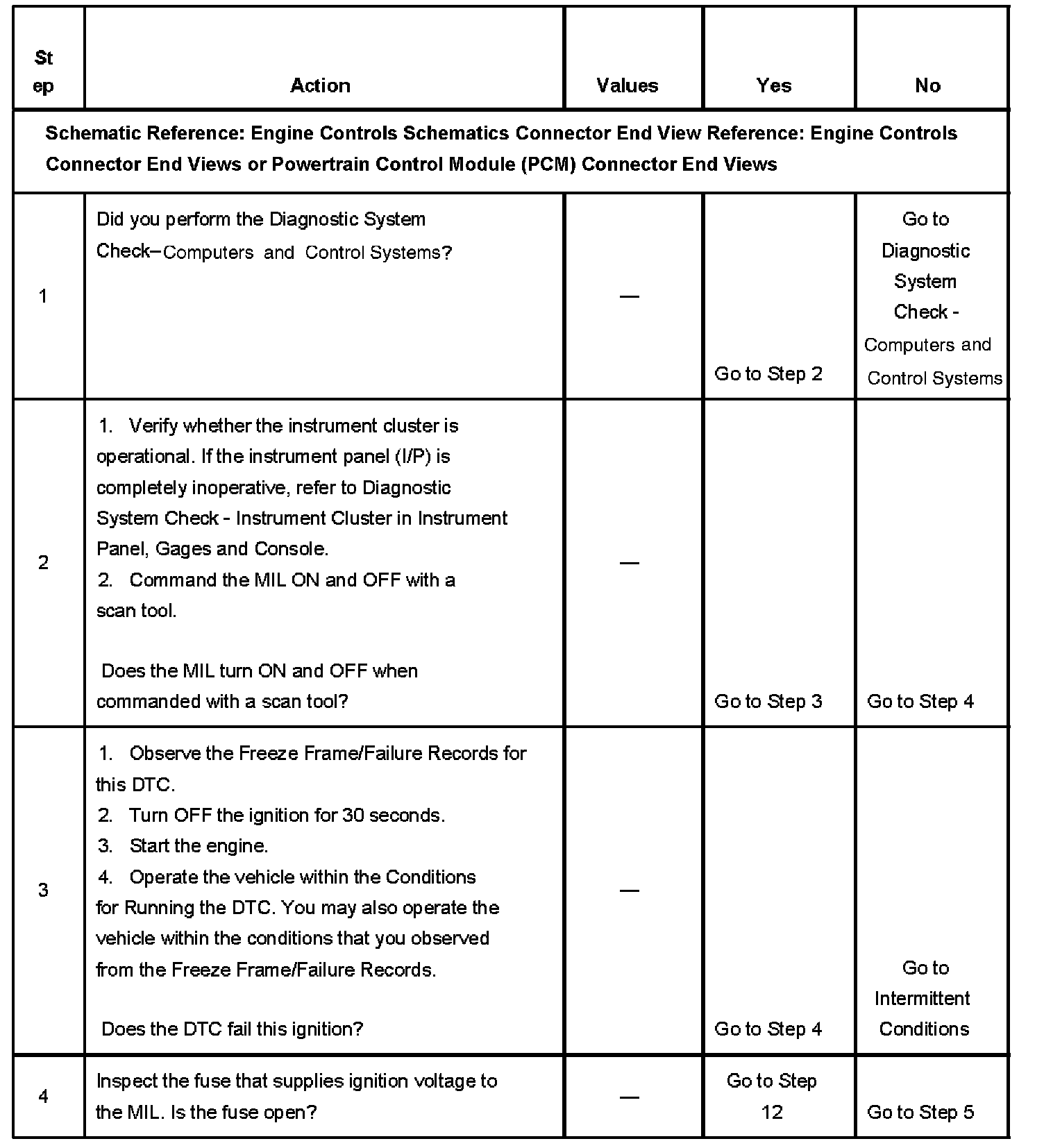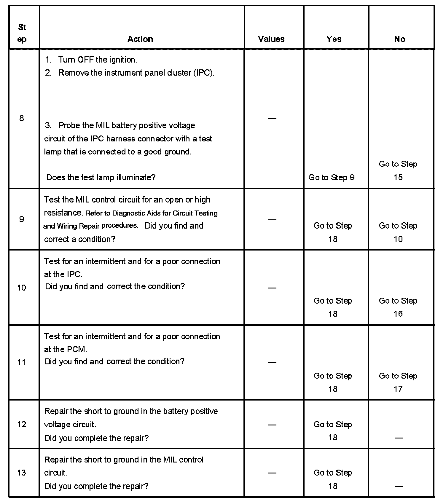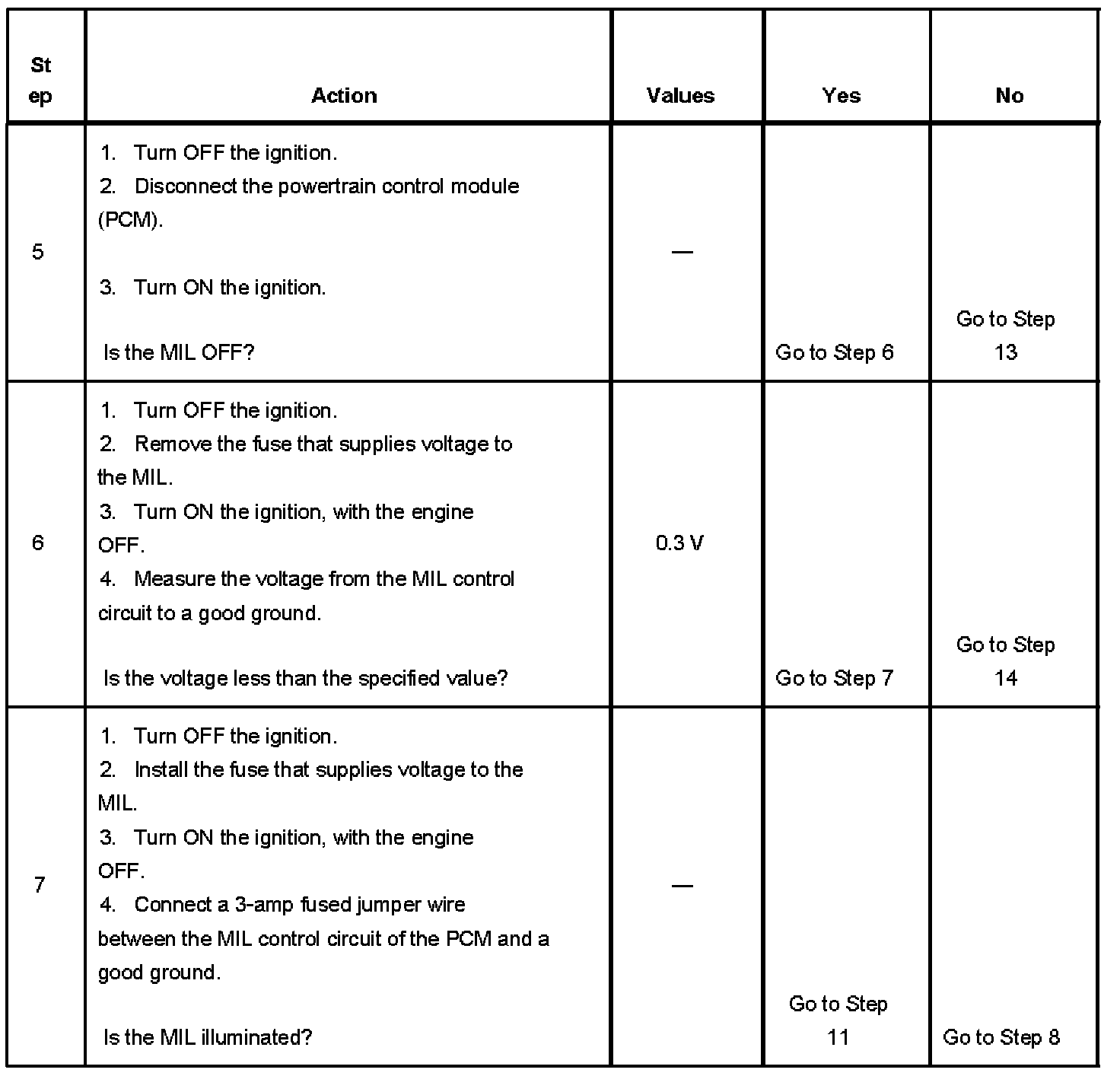 5. This step tests for a short to ground in the MIL control circuit. With the powertrain control module (PCM) disconnected and the ignition ON, the MIL should be OFF.